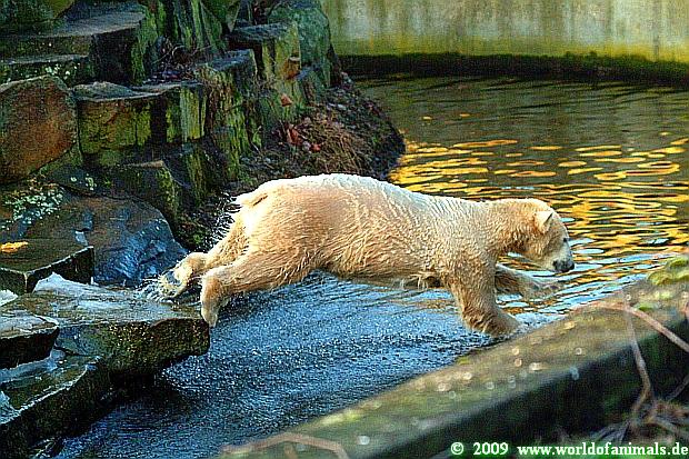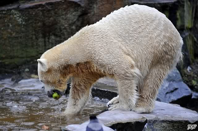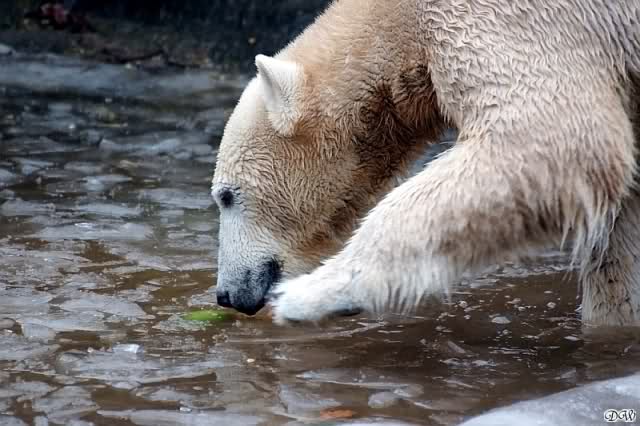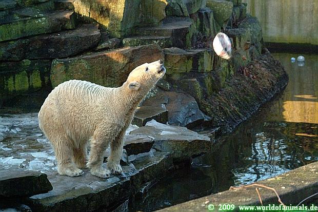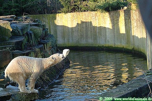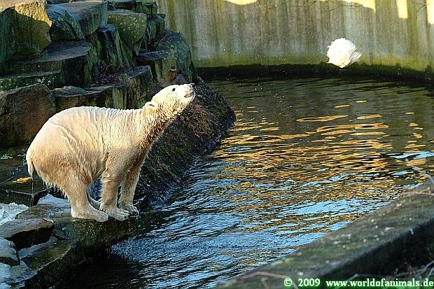 Knut ist in guter Verfassung, bekam gegen 14:30 h wie immer sein Fressen. Da vieles ins Wasser geworfen wurde tauchte er viel und holte nach und nach sein Futter heraus. Dabei kam er dann auf die Idee doch mal wieder die Zweibeiner hinter dem Gitter zu beschäftigen. Also Ball raus aus dem Wasser und den Besuchern entgegen geworfen. Dann auf den Rückwurf warten.