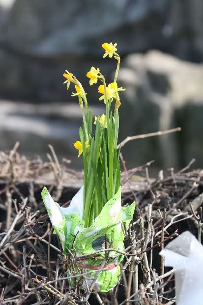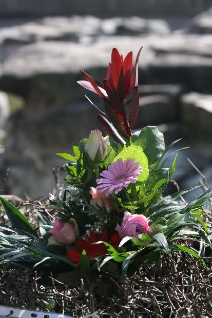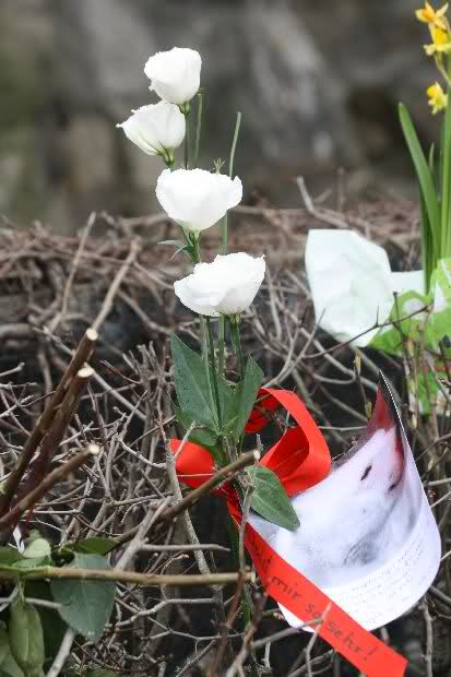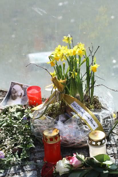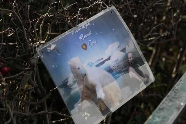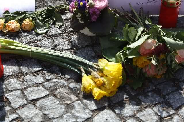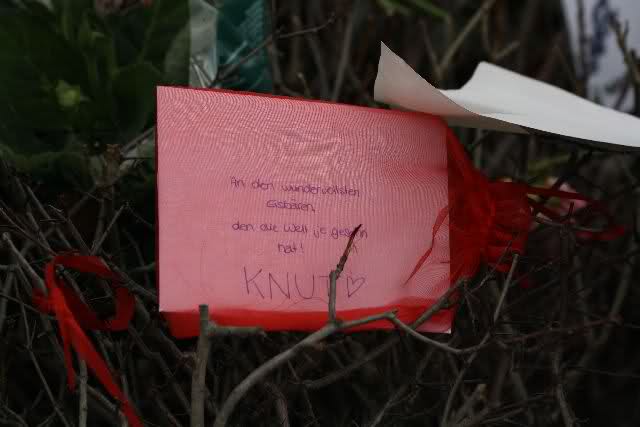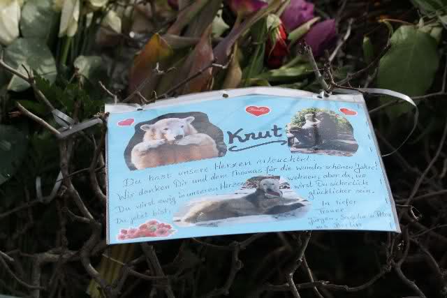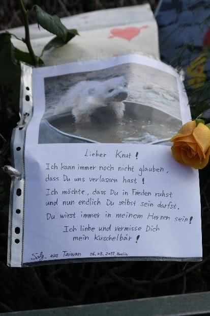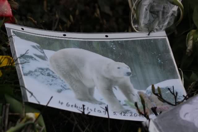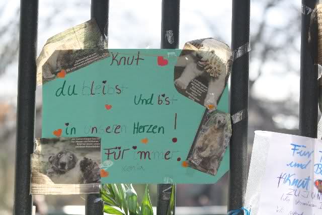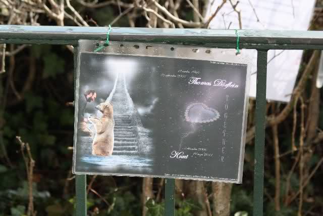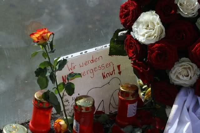 Je näher ich zum Eisbär Felsen kam, um so langsamer wurden meine Schritte. Seit gestern Abend sind wieder viele, viele Blumen dazu gekommen, und auch weinende Männer legen, ganz ehrfürchtig, Blumen für unseren "Knut" ab. Viele Menschen, sämtlicher Nationen, standen dort, wo unser "Knut" einst "wohnte" und schämten sich ihrer Tränen nicht. Es überkam mich (Anne) eine innere Verbundenheit, und etwas wie Ruhe überzog mein wundes Herz.