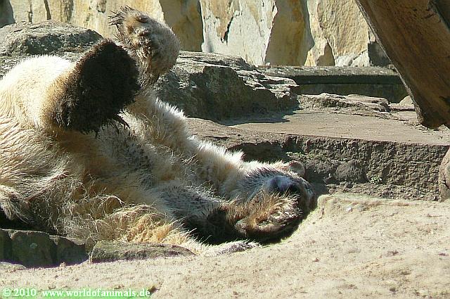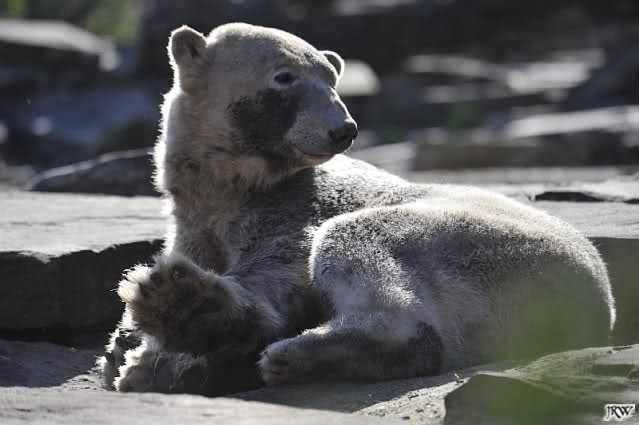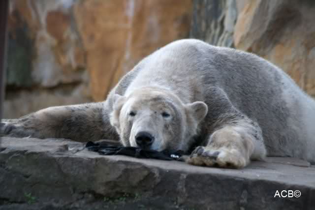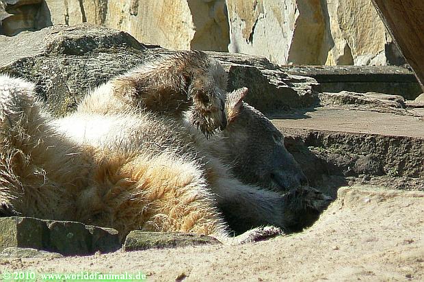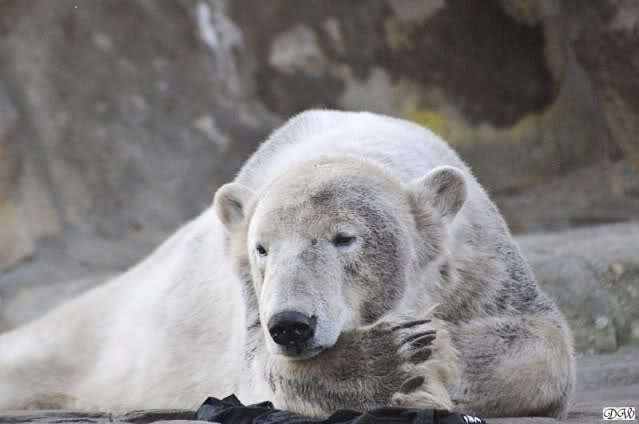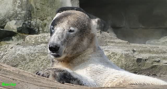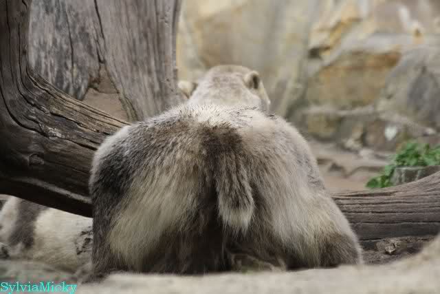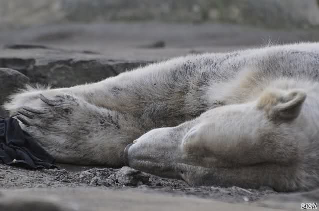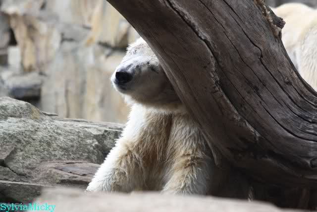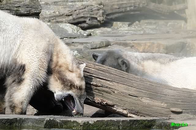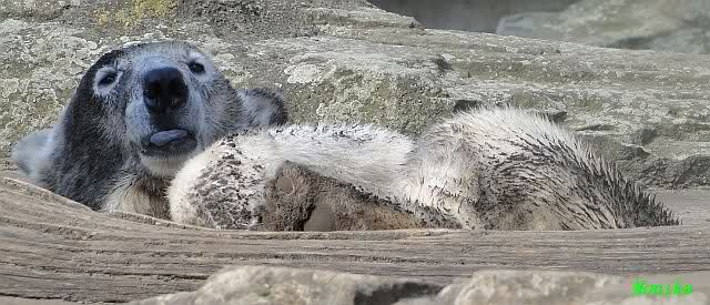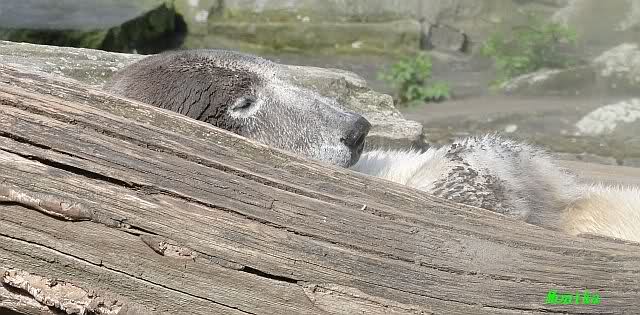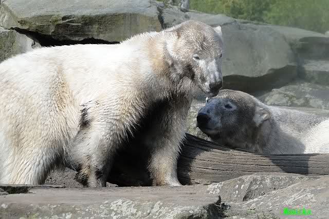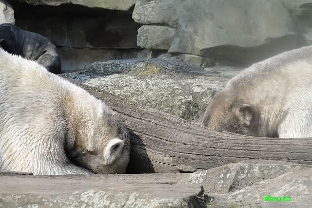 Heute morgen sollen die Beiden schon im Wasser gespielt haben. Als ich etwas später kam, war Knut gerade dabei, sich einzufärben. Immer wenn er sich hinlegte, kam Gianna ganz langsam auf ihn zu, dass er es kaum bemerkte. Wechselte er seinen Platz und schlief wieder ein, kam sie schon wieder auf ihn zu. Entweder war sie heute sehr liebebedürftig oder sie konnte Knut einfach nicht liegen sehen. Als Gianna sich gegen Mittag endlich hinlegte, schwamm Knut eine Runde und legte sich dann auch zur Ruhe.