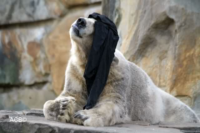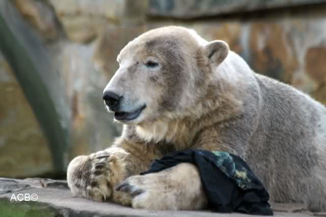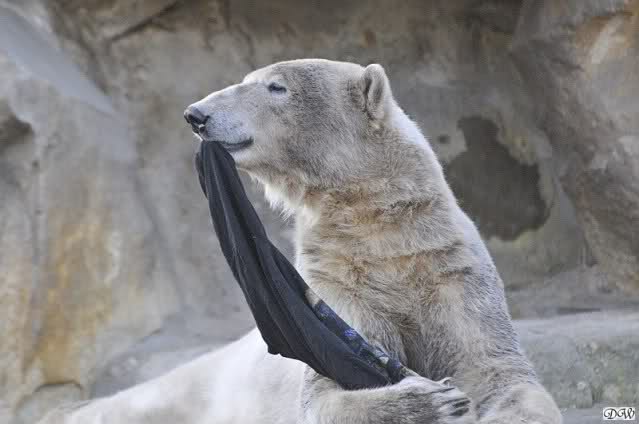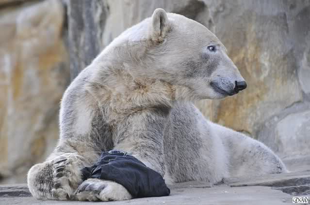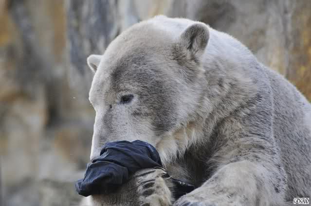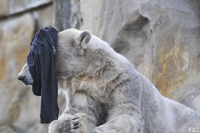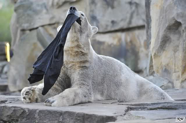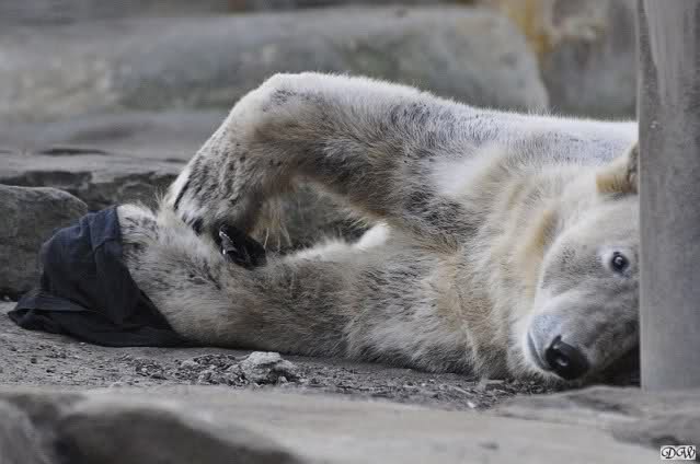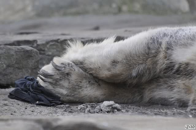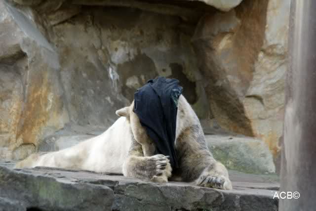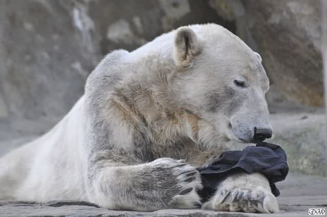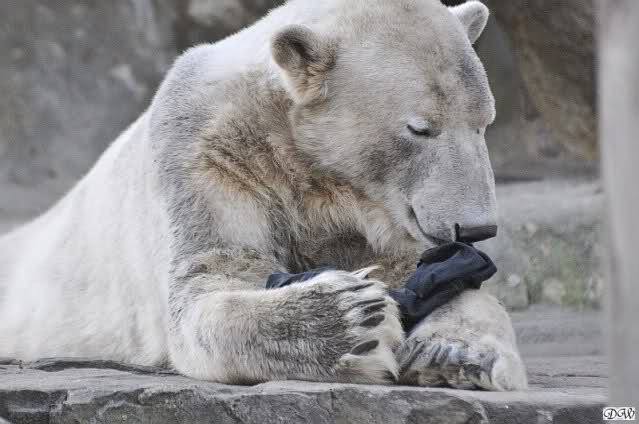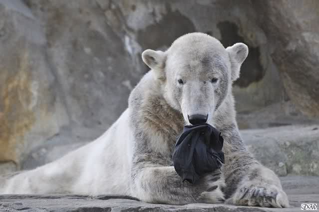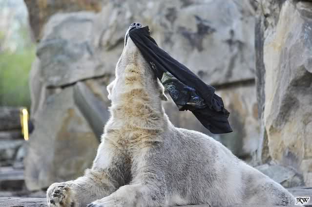 Knut scheint sein T-Shirt immer wieder in seiner Höhle zu verstecken, denn er lässt es nie auf der Anlage liegen. Sicherlich ist das der Grund dafür, dass es noch immer existiert. Turbo-Gianna macht mit solchen Dingen immer ganz schnell Fransen aus den Stoffdingen. Er ist halt nicht nur ein schöner, sondern auch ein kluger Bär! Besonders schön ist es zu sehen, dass er seine alte Gelassenheit wiedergefunden hat und so wundervoll ruhig und gelassen vor sich hin spielt. Immer wieder ist es eine Augenweide ihm zuzusehen.