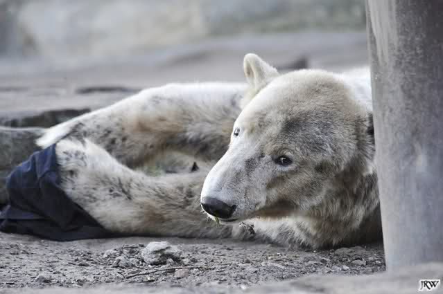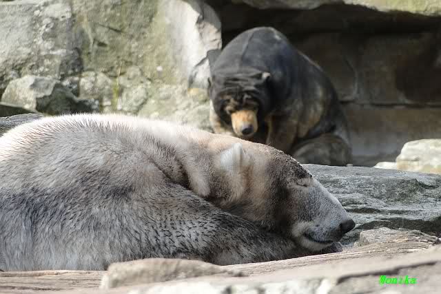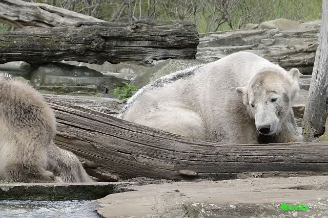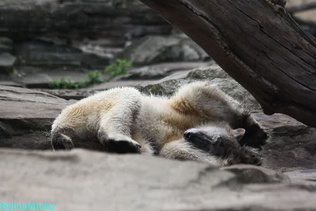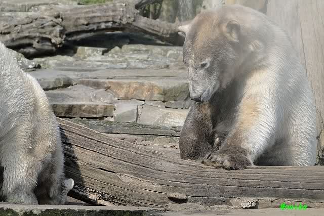 Auch ich war heute Nachmittag bei dem wunderschönen Frühlingswetter kurz im ziemlich vollen Zoo und habe einige Bilder mitgebracht. Nach dem Spielen begaben sich die beiden Bären Youngster zur Sonntagsruhe. Vorher schwärzte sich Knut allerdings wieder ein.
