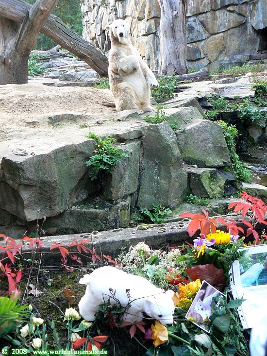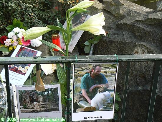 Viel hilft dem Bären auch die Kommunikation mit seinen Besuchern, die ihm ein Gefühl der Normalität geben. Wir alle hoffen, das es so bleiben wird. Es werden immer mehr Blumen, Kerzen und viele Gedichte, Bilder usw. Das gibt allen Knut Freunden das Gefühl mit der Trauer nicht allein zu sein.