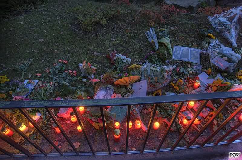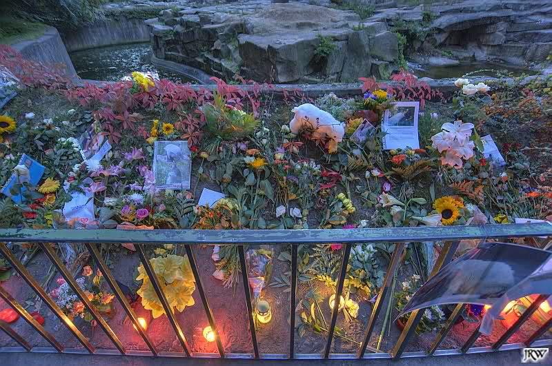 Normalerweise gehe ich am Wochenende selten in den Zoo. Aber weil das Wetter so herrlich und ich allein zu Hause war, entschloss ich mich, in den Zoo zu gehen. Es ist zurzeit vom Äußeren her wunderschön dort. Das Laub färbt sich langsam in den prächtigsten Farben. Es könnte so wunderbar sein… Doch an den unzähligen Blumen und Kerzen vor dem Eingang sieht man, dass es nicht mehr schön ist und nie mehr so werden wird, wie es war…