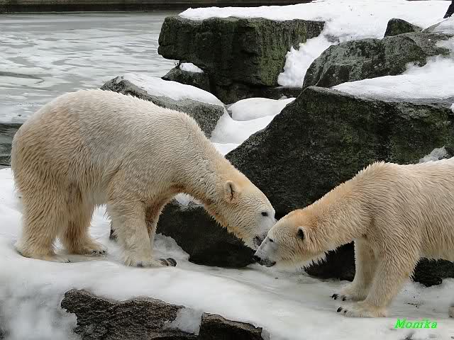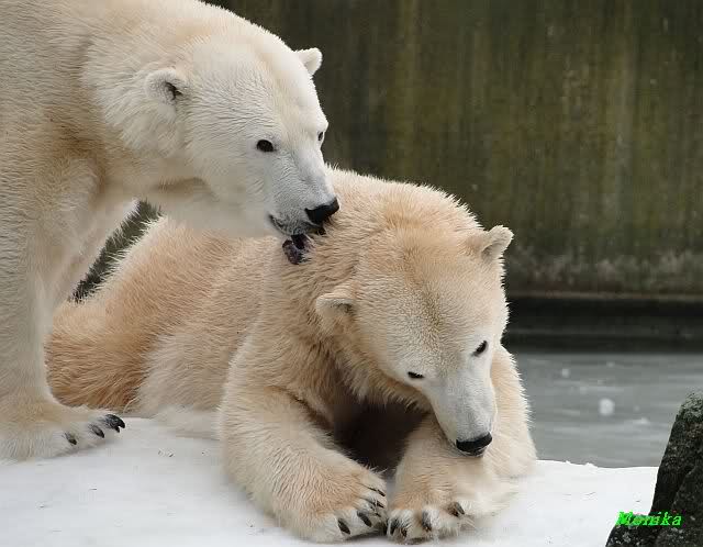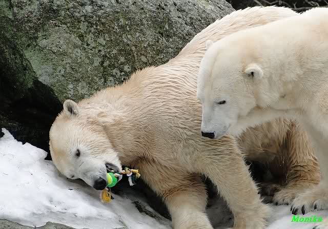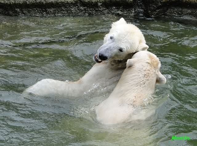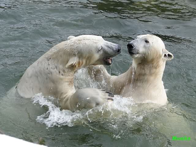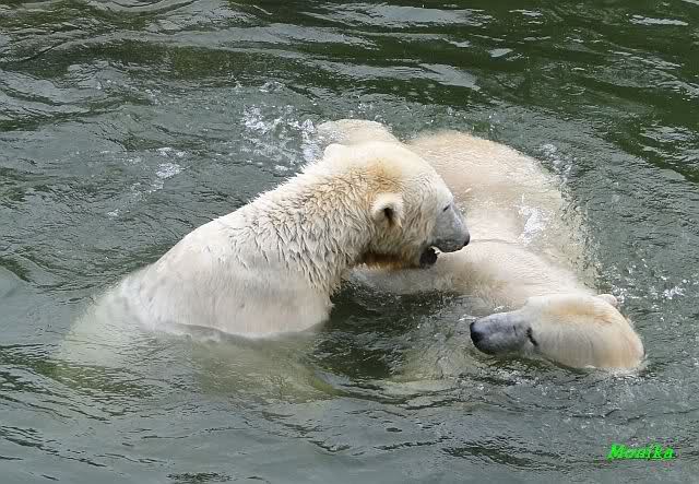 Ha,ha! Solche Missverständnisse passieren mir mit meinem Mann sehr oft. Für uns ist das nicht wichtig, ob Knut und Tosca im Wasser oder am Land gespielt haben. Hauptsache, sie haben gespielt. Es ist immer wieder interessant, wie Knut und Tosca die Nasen in die offenen Schnauzen gegenseitig reinstecken.
