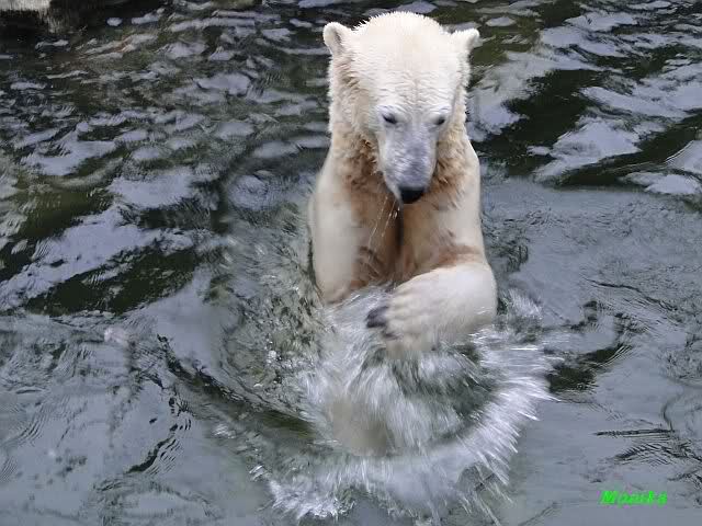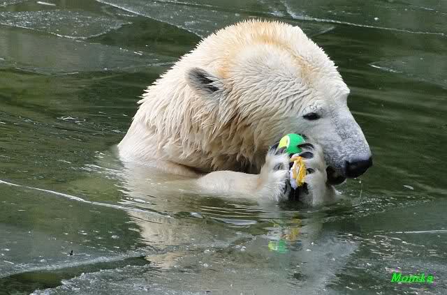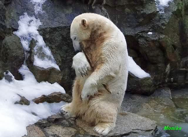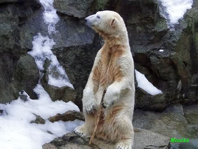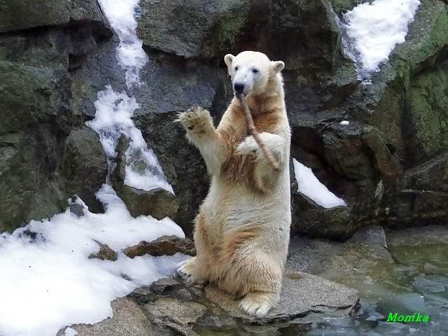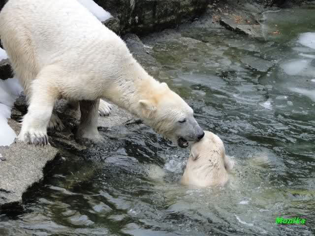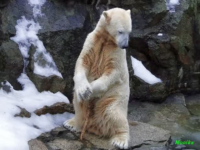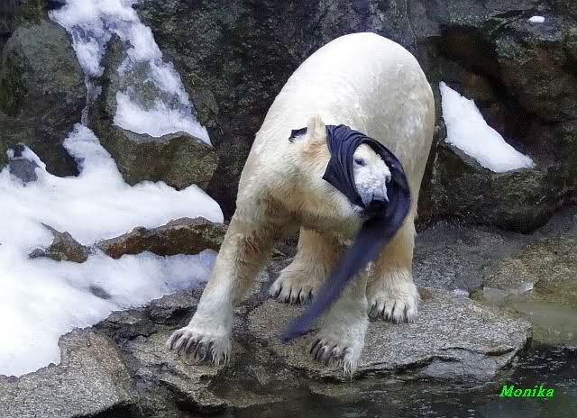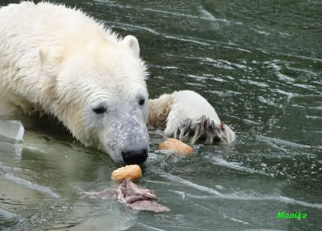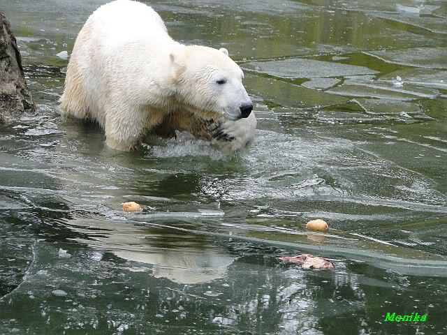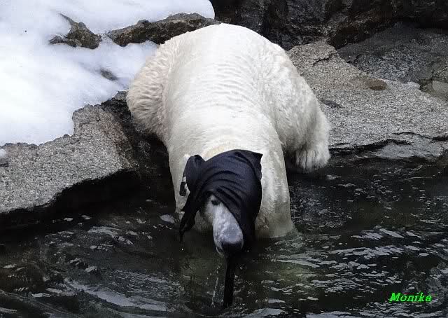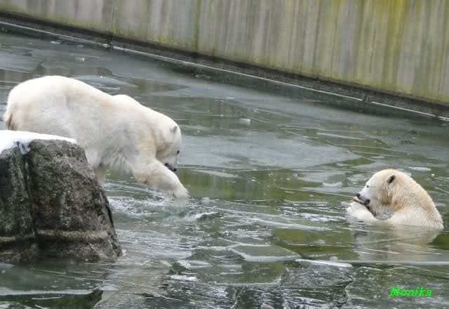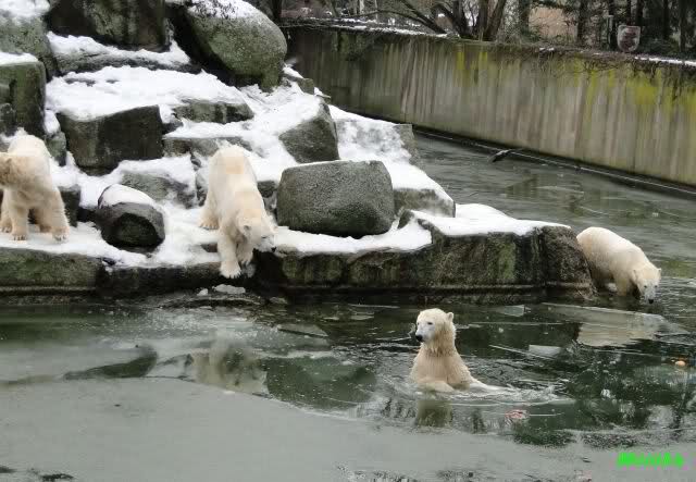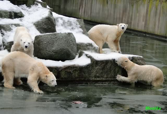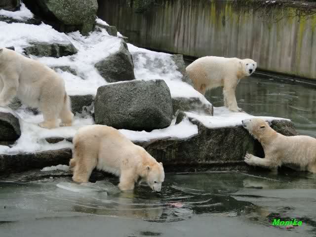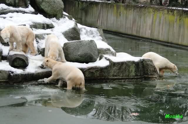 Die Fütterung verlief heute auch mal wieder anders als gewohnt. Sie warteten alle Vier ziemlich dicht beisammen. Das Futter landete aber auf dem Eis. Sie schauten alle ein bißchen dumm aus der Wäsche. Knut winkte, aber es half nichts. Er mußte ins Wasser, was er dann auch als erster tat. Natürlich wurde auch wieder dabei gebrummt. Nancy und Kati gingen leer aus, da sie nicht ins Wasser wollten. Tosca holte sich später noch alles, was sie im Wasser fand.