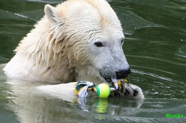 Als Fr. Weckert mit dem Futtereimer kam, suchte sie erstmal die Bären. Knut war noch hinten im Wasser, und Tosca spielte mit einem Tau mit Tennisball, das wohl wieder jemand verbotener Weise reingeworfen hat. Obwohl Fr. Weckert ein paar Mal gerufen hatte, spielte Tosca lieber mit dem Tau und Knut ließ sich auch erst nicht blicken.