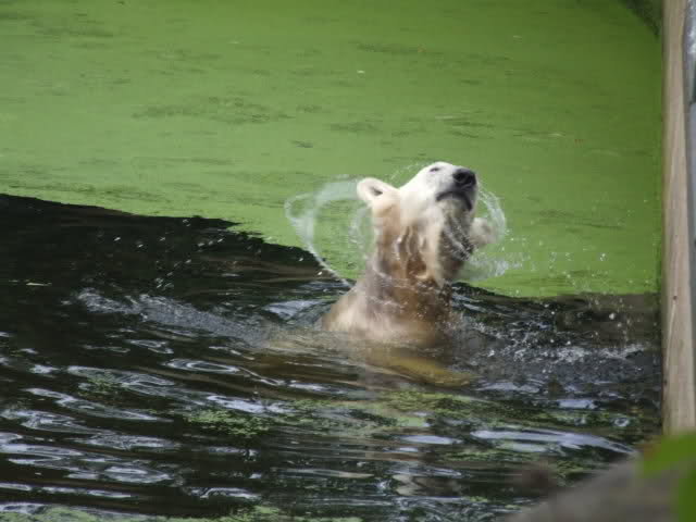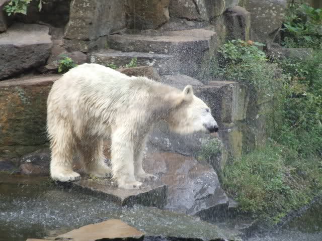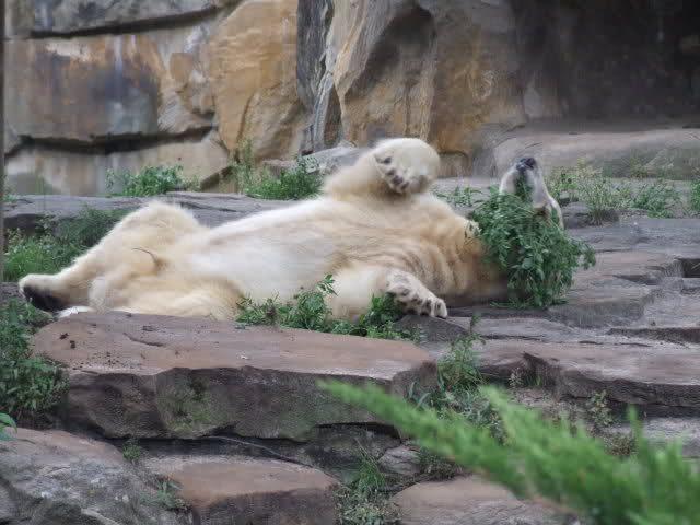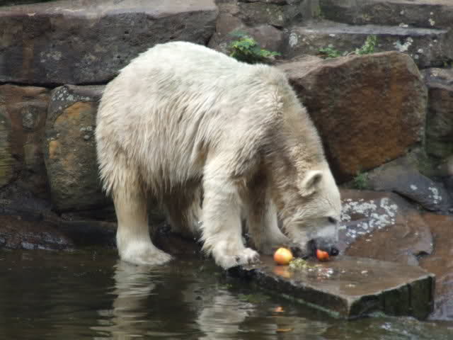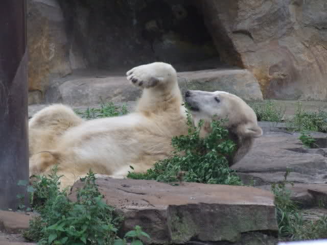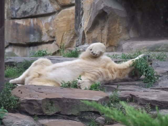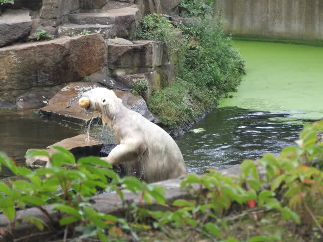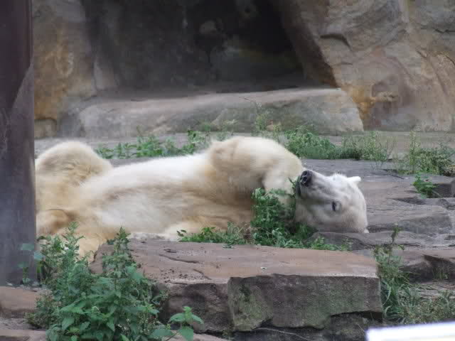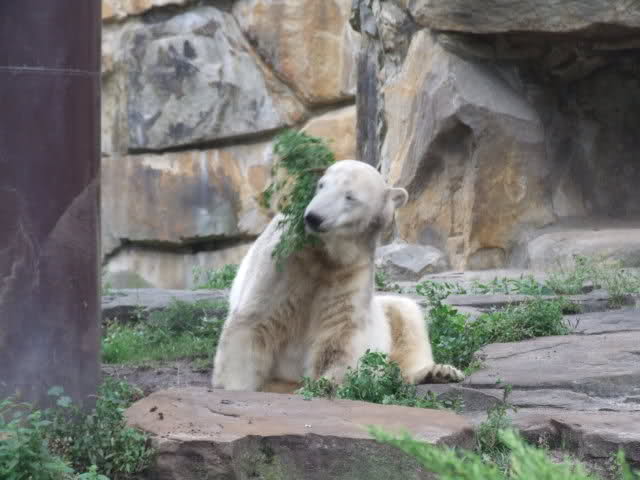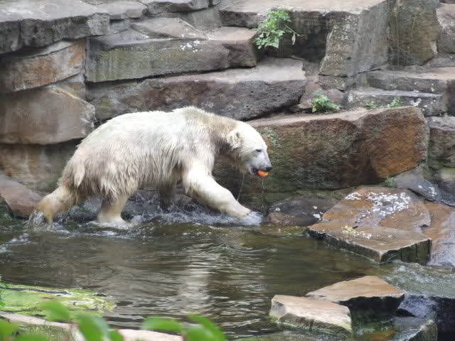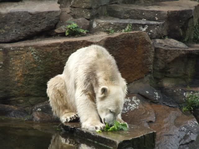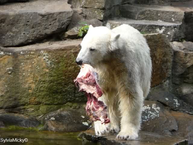 Knut bekam heute ein großes Stück Fleisch, daß er auch über die Anlage schleppte. Außerdem Fische, Obst und Brötchen, also reichlich. Er fühlte sich sichtlich wohl.