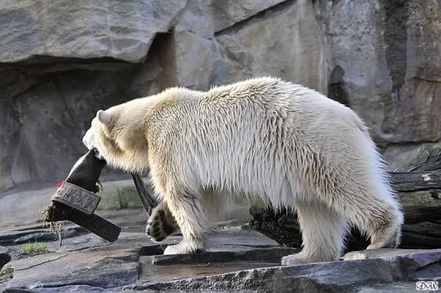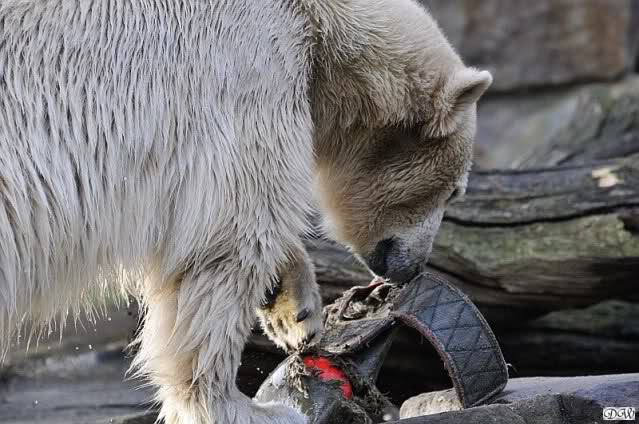 Gianna sah etwas im Wasser, sprang hinein und entdeckte, dass man in dem klaren Wasser sehen konnte. Dann ging das Gianna-Feuerwerk los. Sie fand noch Fische und tauchte immer wieder. Knut war oben und sah zu. Immer wieder schaute sie zu ihm hoch und es wurde an allen Ecken und Enden "geschnäuzelt" und "betatzt". Dann fand sie SPIELZEUG. Das Nackthuhn. Sie drehte und wendete es - und es machte Geräusche. Der rote Ball im Innern interessierte sie. Sie zupfte und schüttelte es, trug es herum. Es war schön anzusehen. Jemand sagte, wetten dass sie es in kurzer Zeit schafft, was Knut in zwei Jahren nicht geschafft hat, das Huhn kapputt zu kriegen. Sie fand auch die Pflanzkugeln, die im kleinen Pool lagen. Damit spielte sie kurz. Sie sprang wieder ins Wasser und tauchte kurz nur um mit der Baumscheibe aufzutauchen. Aber in Gianna-Art ging alles schnell. Sie war zu aufgeregt. Soviele neue Dinge. Sie hatte erst einen Ball am Wickel, dann fand sie den anderen. Danach kam was niemand wirklich erwartet hatte. Sie stellte sich in Position und warf den Ball zu den Zuschauern. Am oberen Rand pralle er wieder ab. Sie holte ihn aus dem Wasser, flitzte in Windeseile nach oben und warf den Ball von dort in Richtung Braunbären, wieder prallte er ab, wieder hechtete sie hinterher und brachte ihn nach oben. Sie warf ihn noch einmal und schon lag er in der Hecke des Braunbärengeheges.