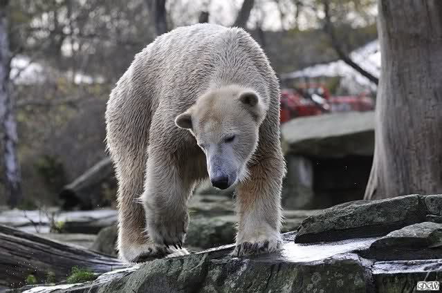 Es war ein gigantischer Tag bei Knut und Gianna heute. Obwohl Herr Henkel mir gestern sagte, dass die beiden Bären heute wahrscheinlich nicht auf der Anlage sein würden, hat man es doch geschafft, Knut kurz nach 12.00 herauszulassen. Der Absaugwagen, der den ganzen Schlamm heraussaugt, war nach Aussagen einiger Besucher schon früh da und begann mit der Arbeit. Dann wurde sofort Wasser eingelassen und Knut kam auf die Anlage., Man erzählte mir, dass er begeistert ins Wasser gesprungen sei und alles genau inspiziert hätte.
