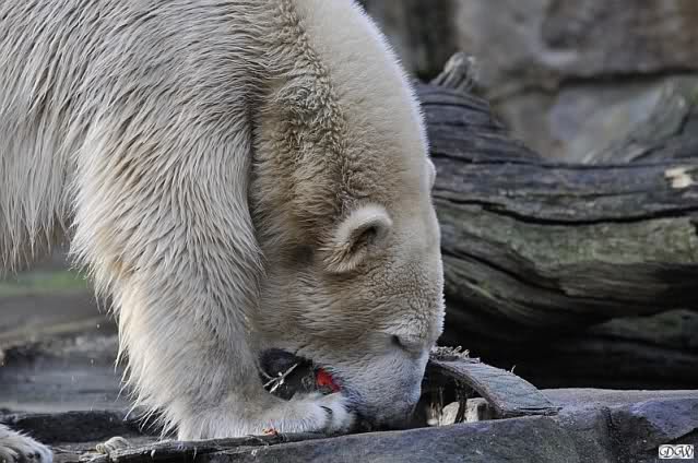 Die Fütterung machte ein junger Mann, der sich wacker um Knut bemühte. Es flog auch Fleisch auf die Anlage, Äpfel und Brötchen auch. Dann kam SIE! Heute war auf jeden Fall Gianna-Tag. Wie ein Staubsauger fegte sie über die Anlage und fraß Brötchen und Äpfel unter Knut's kritischen Blicken, sie übersah das Fleisch. Er hüpfte hoch und holte es sich, ging zum Tisch hinunter um es zu fressen und als sie unvermittelt auftauchte, schluckte er es ungekaut mit einem unglaublichen Blick herunter. Alle Zuschauer jubelten.
