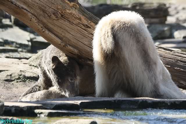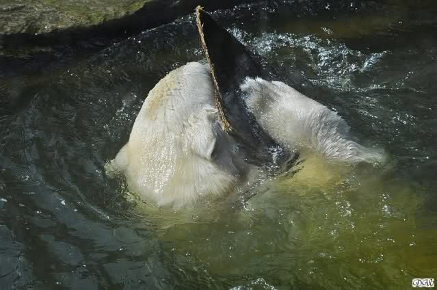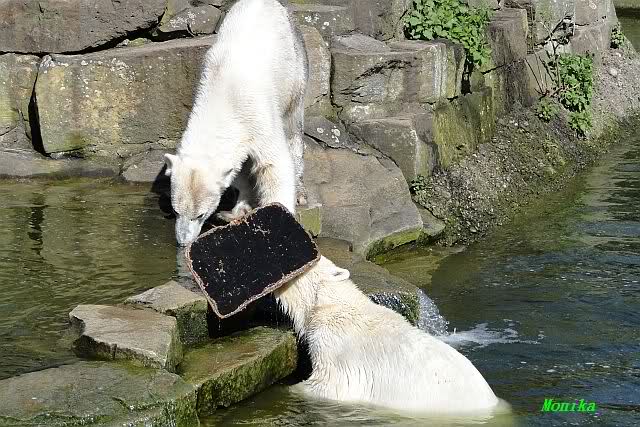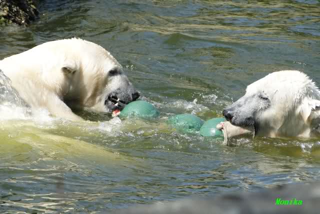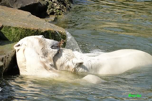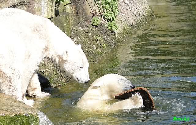 Zur Fütterung bekam Knut u.a. einen schönen großen Lachs. Gespielt haben die beiden nicht viel am Nachmittag. Aber Knut färbte sich wieder rabenschwarz ein. Am Spätnachmittag strömten noch viele Besucher in den Zoo.