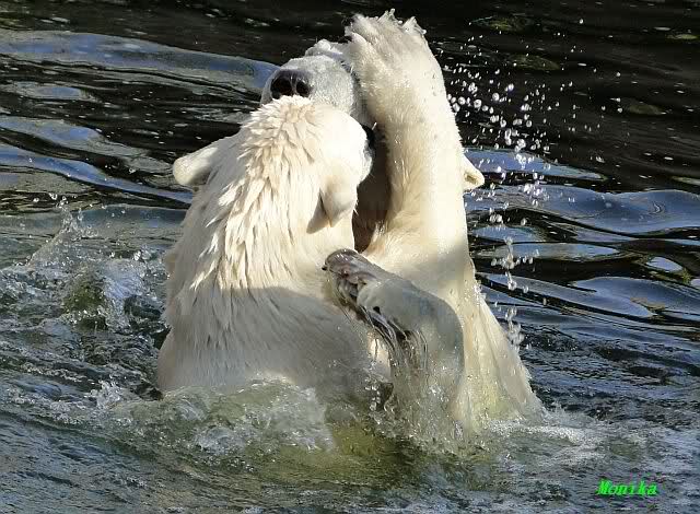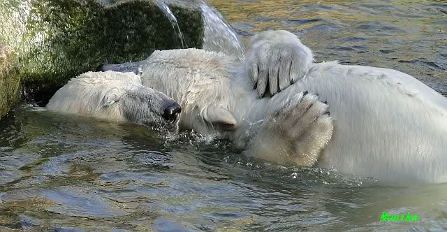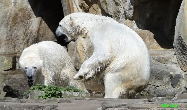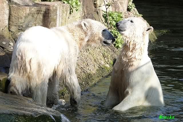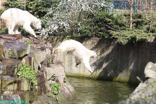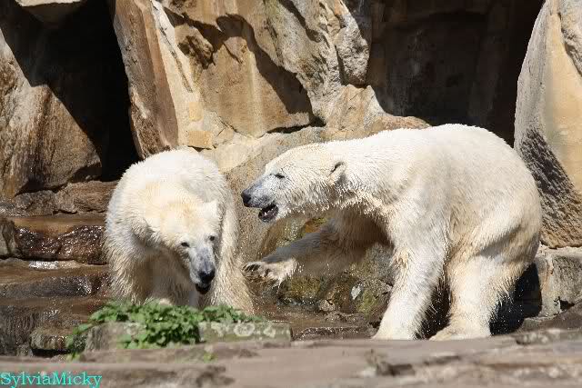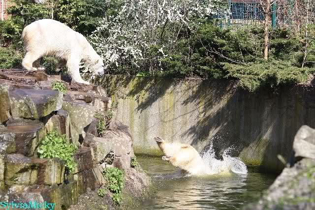 Bei strahlend blauem Himmel, Sonne satt und warmen 20 Grad waren Knut und Gianna heute in bester Spiellaune. Sie tobten bereits um 9.00 Uhr im Wasser. Zwischendurch wurde mal ein wenig geruht und gelaufen, um dann wieder erholt über die Anlage zu rennen, immer wieder ins Wasser zu springen um dort zu spielen. Als ich eine halbe Stunde nach der Fütterung ging, spielten sie immer noch im Wasser.