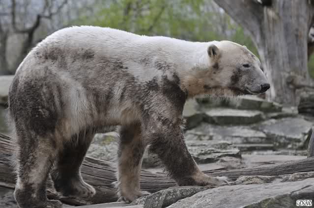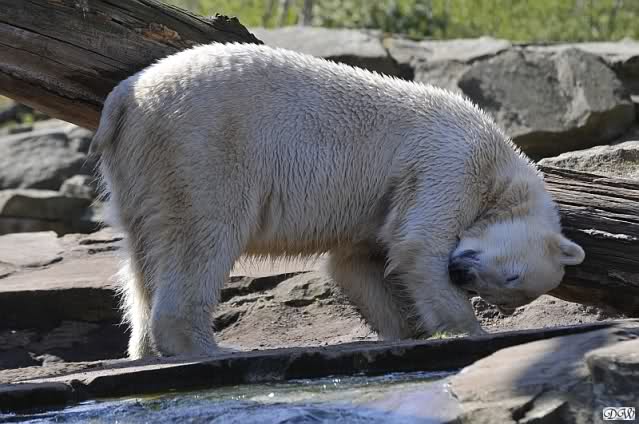 Gianna und Knut hatten am Vormittag gespielt, erst mit dem Nackthuhn und dann zusammen im Wasser. Nachmittags ging es eher ruhig zu, aber schön sind die Beiden trotzdem zu jeder Zeit. Knut färbte sich wieder einmal in Blitzesschnelle ein und viele der Besucher können es immer gar nicht glauben, dass sie Eisbären anschauen. Wenn man ihnen erklärt, wie viel Freude die Tiere daran haben sich im Sand zu wälzen und dass alle neuen Gehege Naturboden haben, sind sie meistens einsichtig und genießen den Anblick.