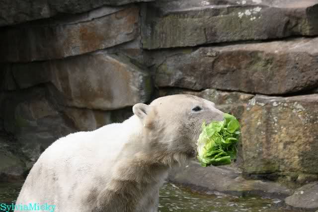 Nach der Fütterung verteidigte Knut den ungeliebten Salat erfolgreich gegen Gianna. Das war das erste Mal, daß ich das gesehen habe. Ausgerechnet den Salat. Er hatte wohl noch Hunger. Es gab auch nicht viel.