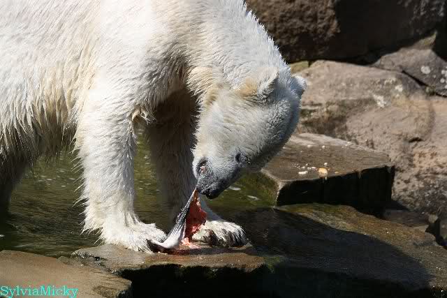 Knutfreunde brachten eine Lieferung mit Leckereien für alle Bären und die Lachse kamen bei den Tieren wieder gut an. Herr Röbke fütterte die großen Eisbären am frühen Nachmittag. Er warf die Lachse so gut, dass jede der Eisbärinnen ihren Anteil bekam. Bei den Braunbären das gleiche Spiel. Wie meistens, schnappte sich Petzi ihren und verschwand in der Höhle während Siddy ihren draußen verspeiste.
