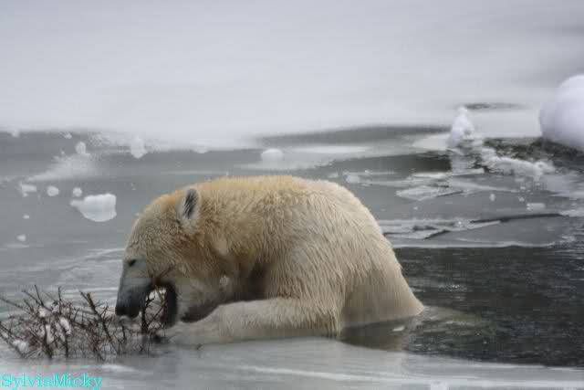 Nach der Fütterung suchte Tosca im Wasser noch Reste und versuchte danach den eingefrorenen Baum ohne Nadeln vom Eis zu bekommen. Sie versuchte sich wieder als Eisbrecher. Schließlich gelang es ihr an den Baum zu gelangen. Sie hatte dann den Baum mit Eisschollen am Wickel.