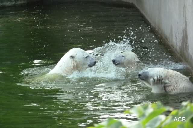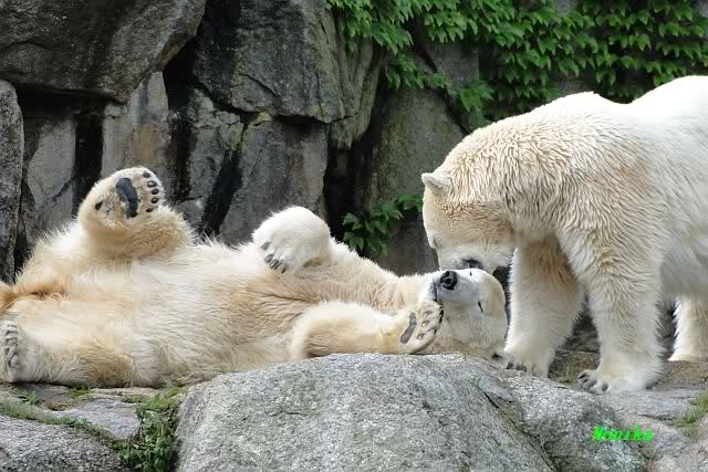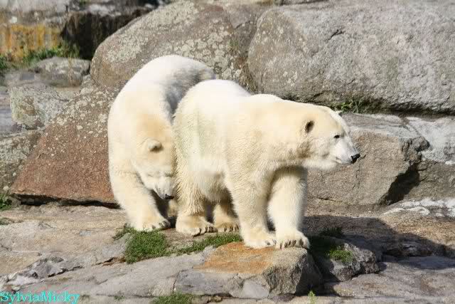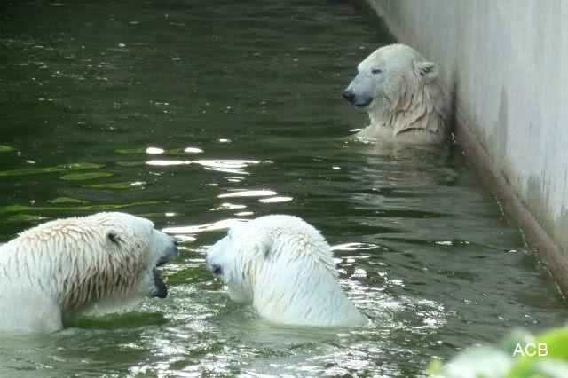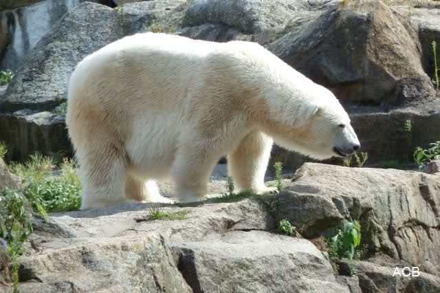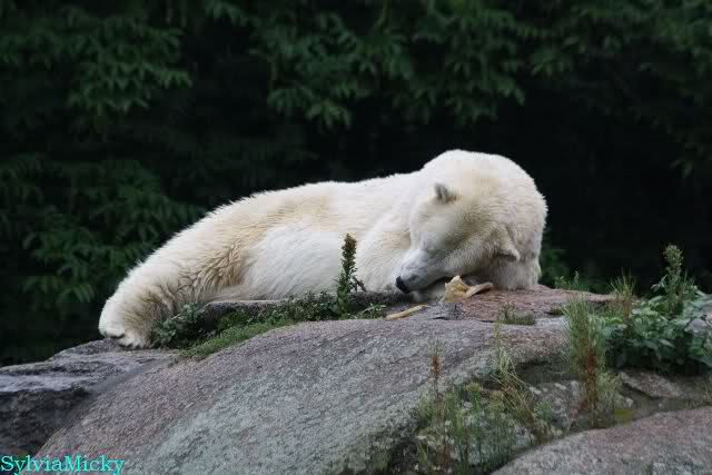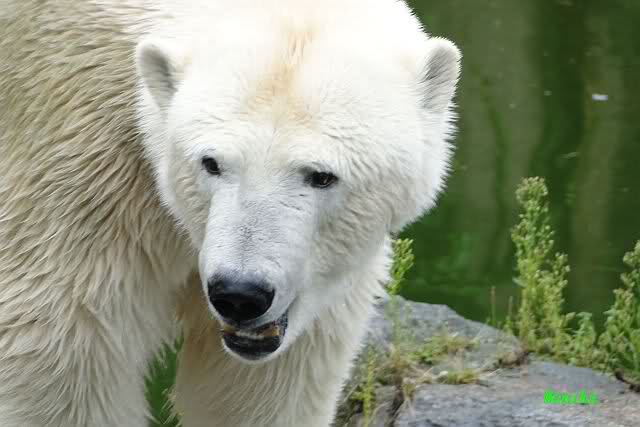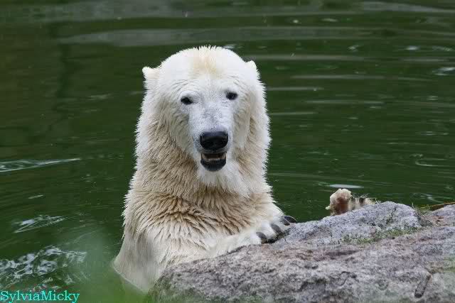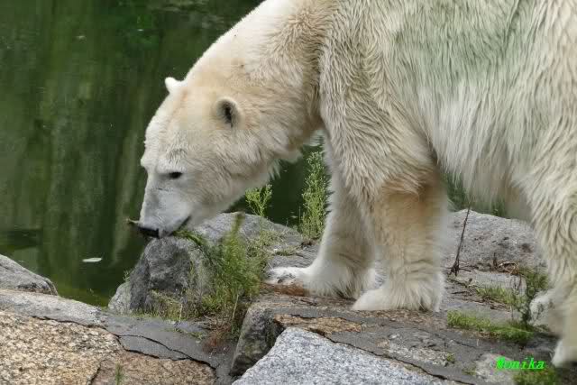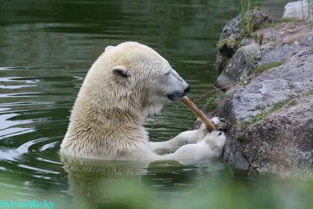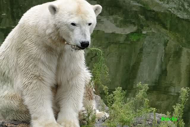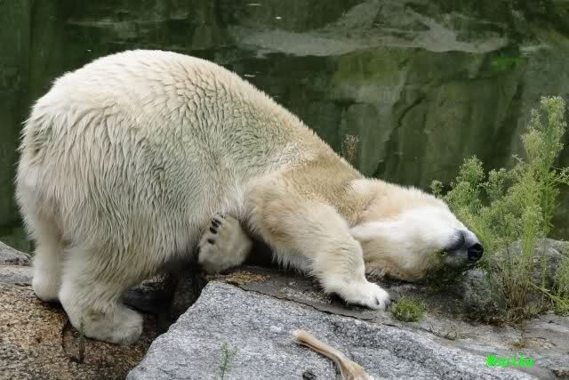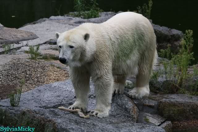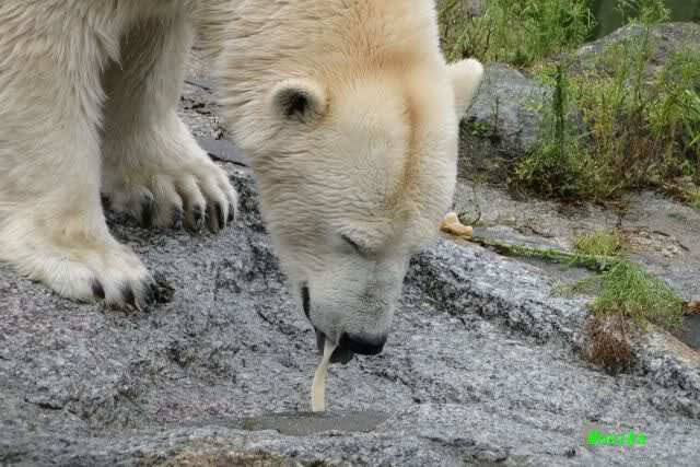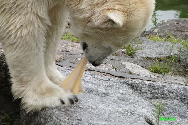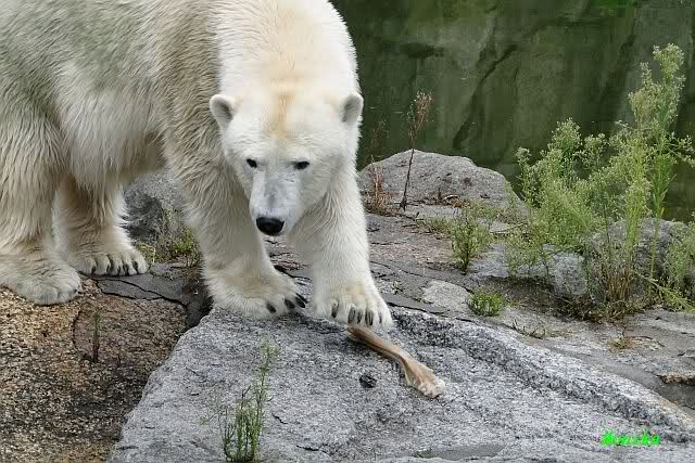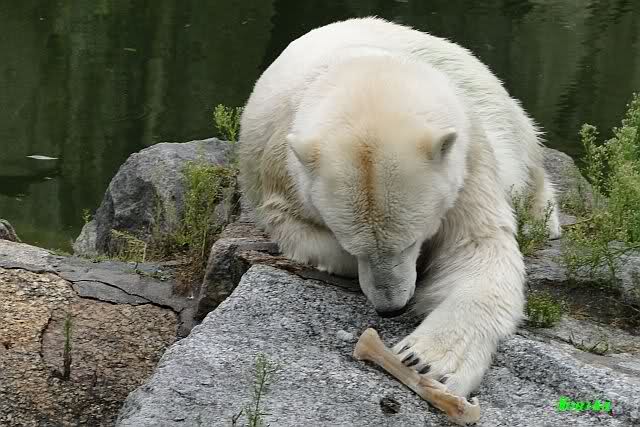 Die drei Eisbärenmädels haben heute wieder Kauknochen bekommen. Am Spätnachmittag saß Tosca vor ihrem Knochen. Auf folgenden Fotos sieht man wieder die unverkennbare Ähnlichkeit mit Knut. Auch Tosca gärtnerte heute.