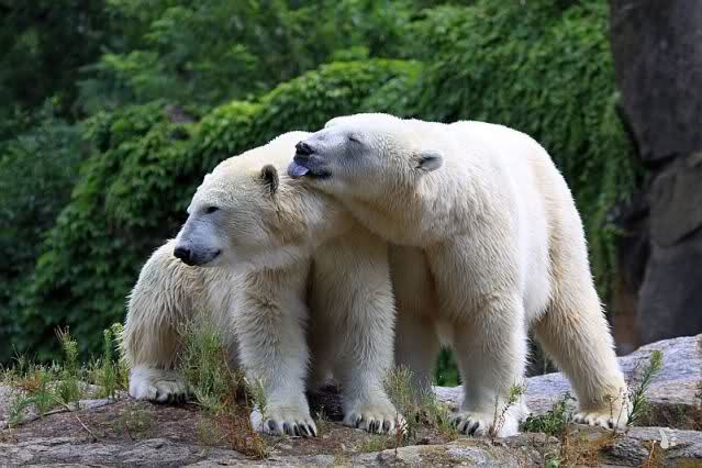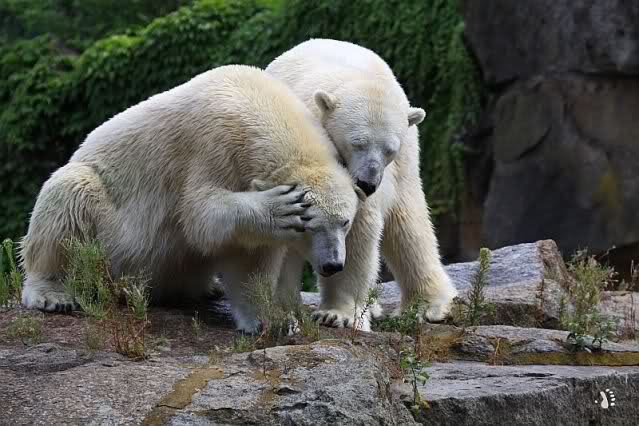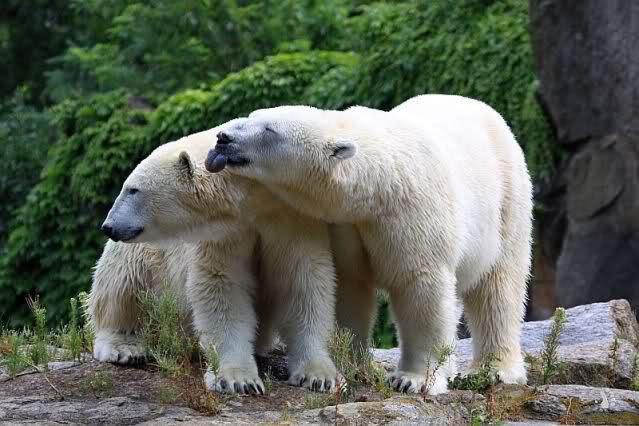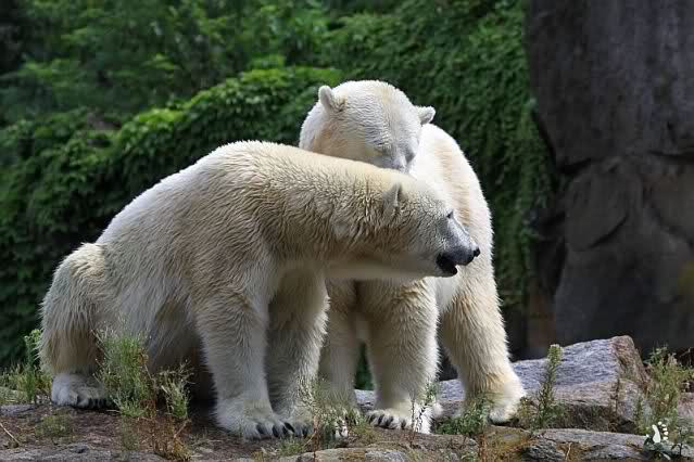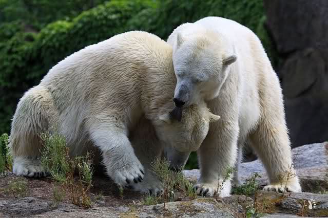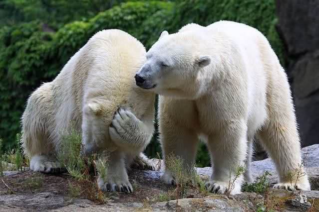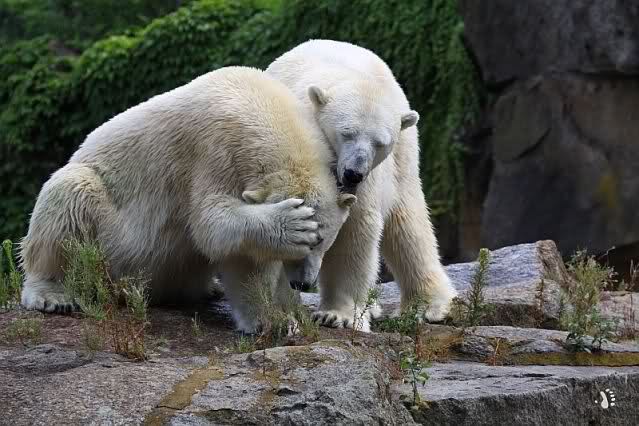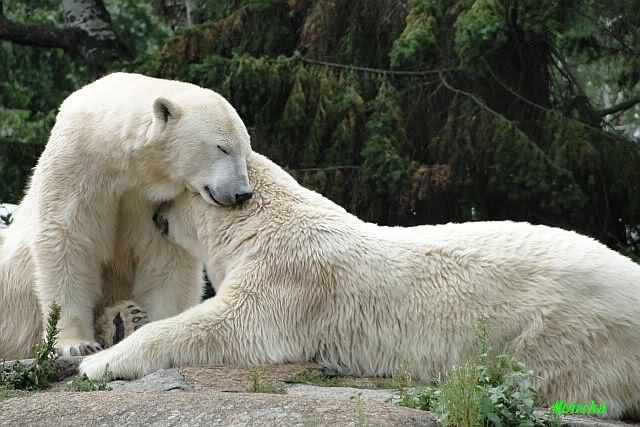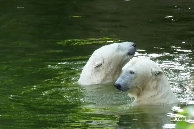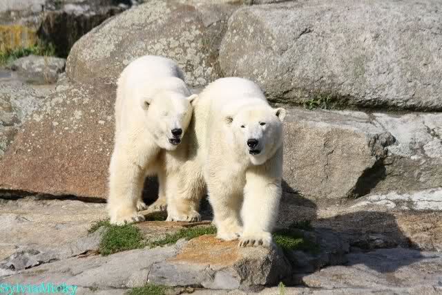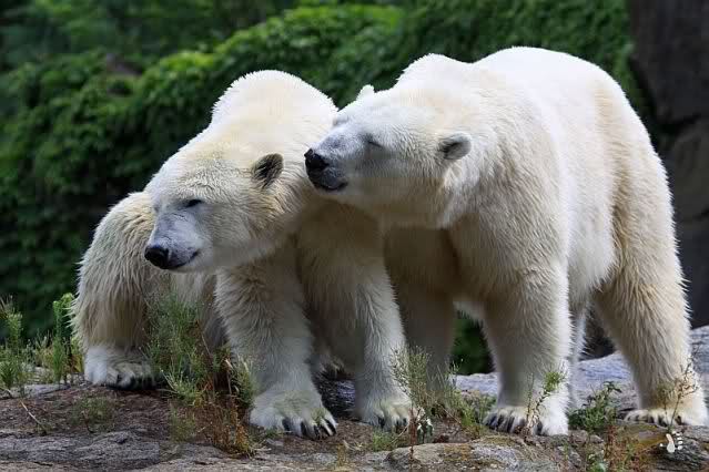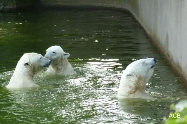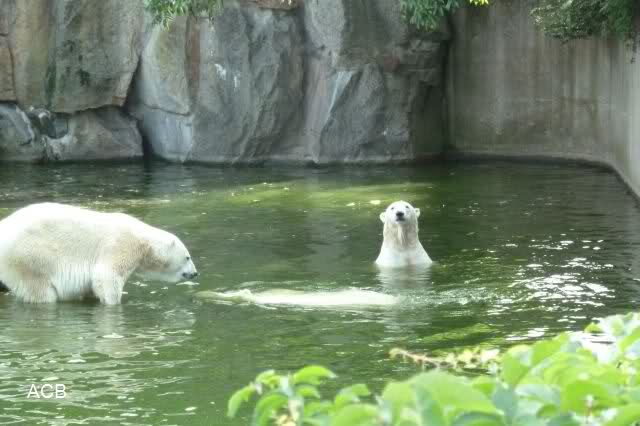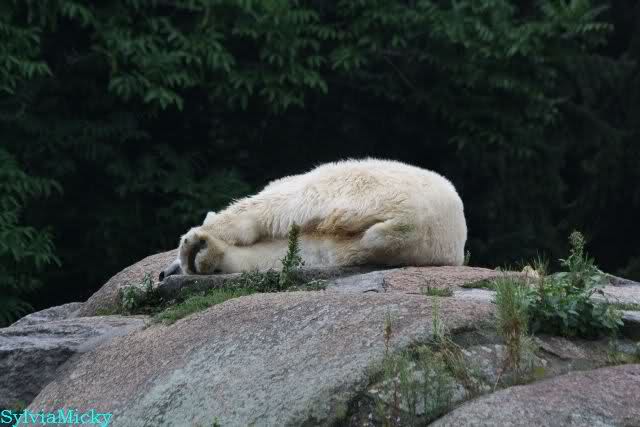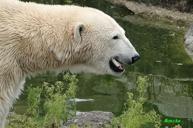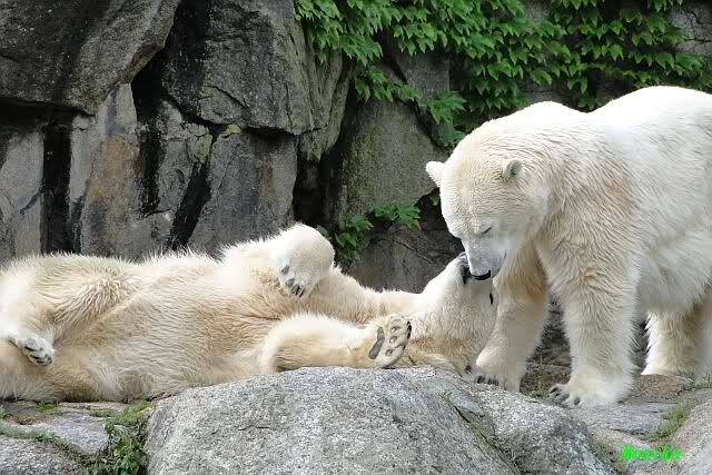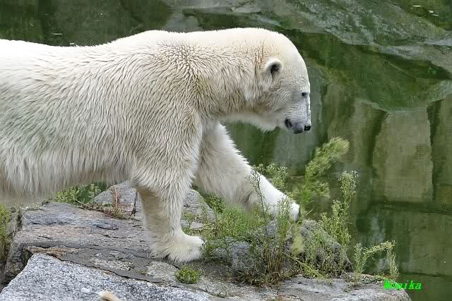 Die drei Eisbärenmädels haben heute wieder Kauknochen bekommen. Am Spätnachmittag saß Tosca vor ihrem Knochen. Auf folgenden Fotos sieht man wieder die unverkennbare Ähnlichkeit mit Knut. Auch Tosca gärtnerte heute.