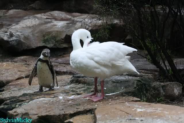Der Coscorobaschwan hat einen Freund. Der kleine Pinguin steht immer in seiner Nähe