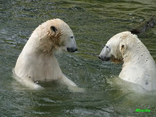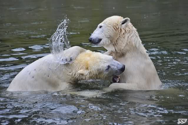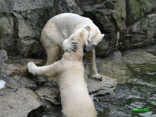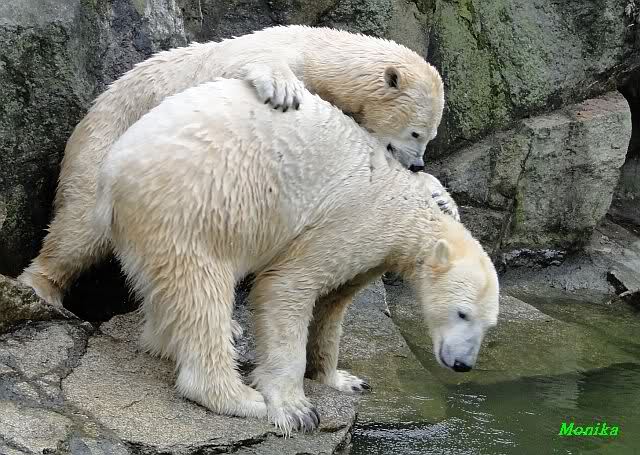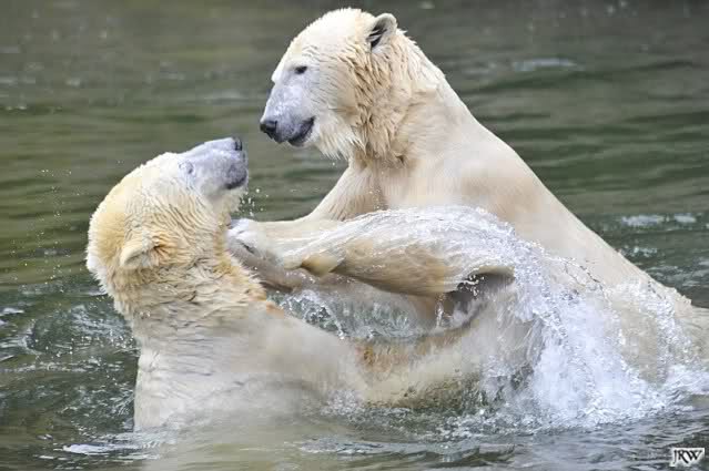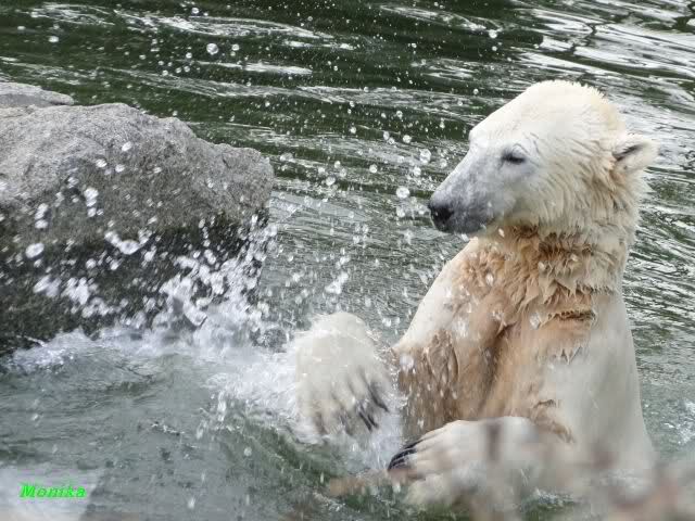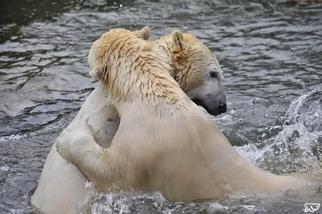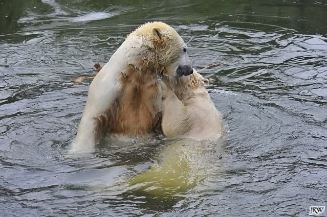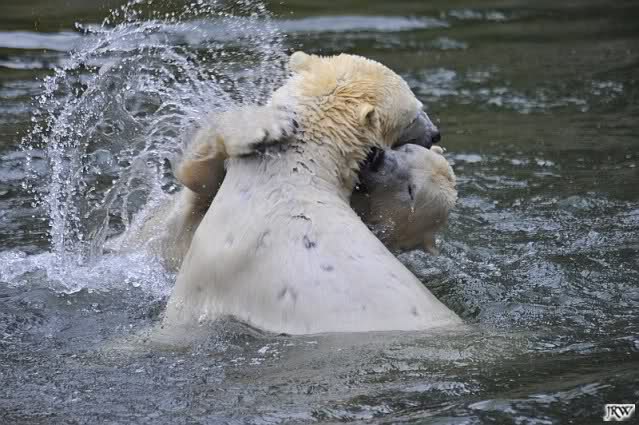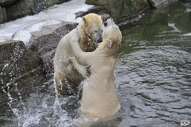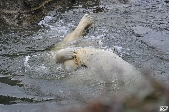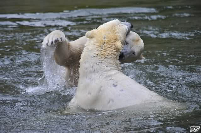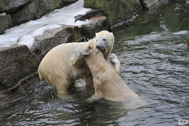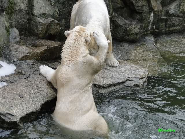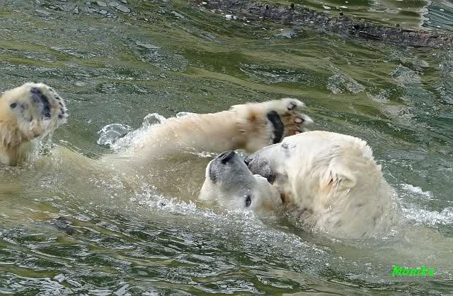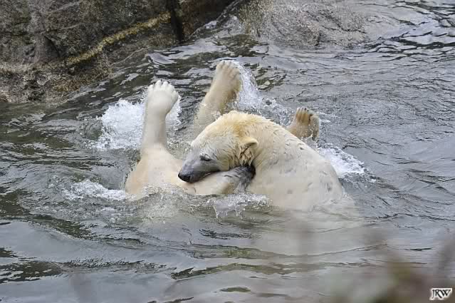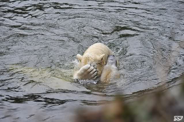 Als Knut genug von der Langeweile hatte, paddelte er wieder wie wild im Wasser. Nach einiger Zeit hatte er auch Erfolg und Tosca kam. Es folgten wieder wilde Wasserspiele, wobei Tosca teilweise ganz schön grob war. Irgendwann war es Knut zuviel und er ging auf die Insel. Tosca folgte ihm, sprang aber dann doch lieber wieder runter. Später spielten sie aber doch wieder gemeinsam im Wasser.
