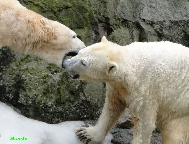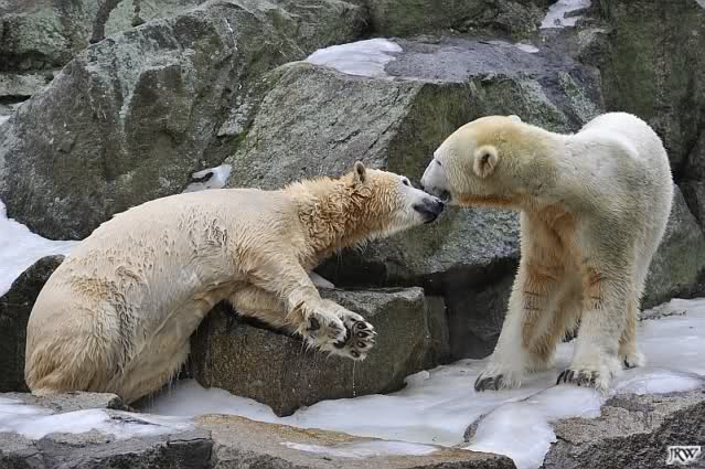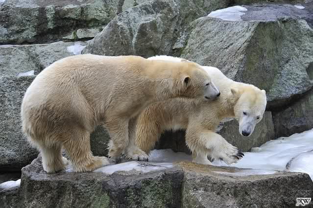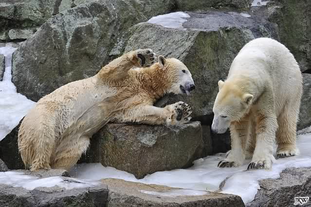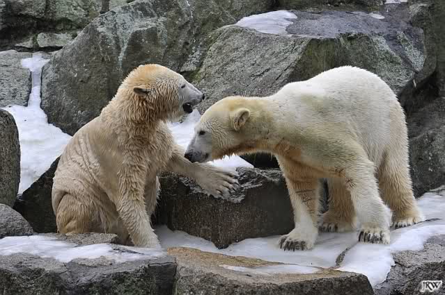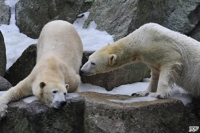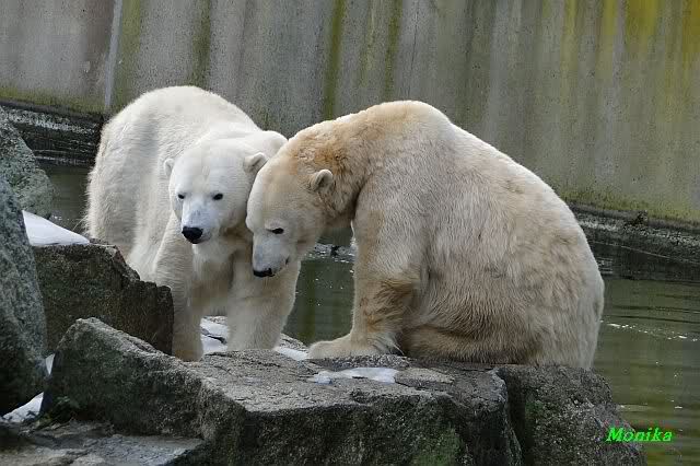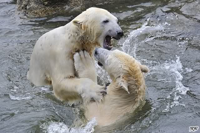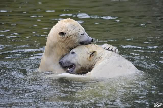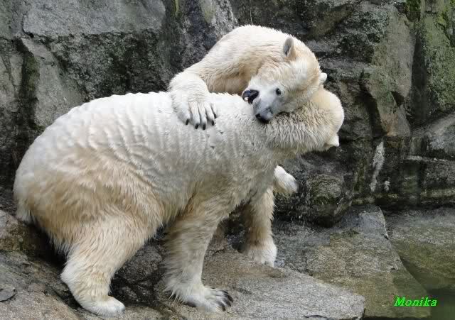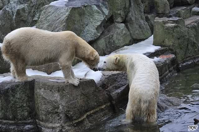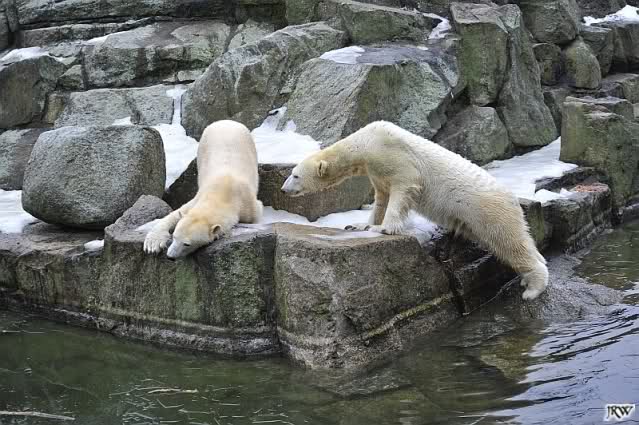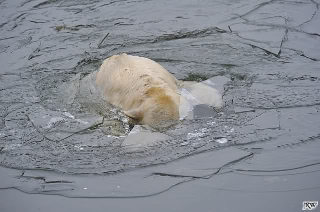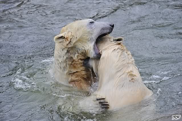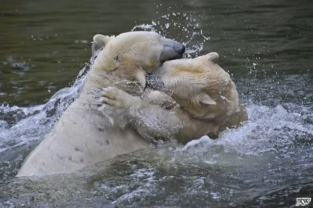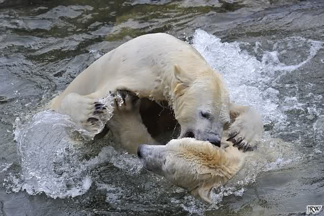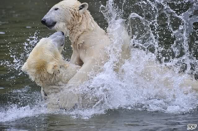Als Knut genug von der Langeweile hatte, paddelte er wieder wie wild im Wasser. Nach einiger Zeit hatte er auch Erfolg und Tosca kam. Es folgten wieder wilde Wasserspiele, wobei Tosca teilweise ganz schön grob war. Irgendwann war es Knut zuviel und er ging auf die Insel. Tosca folgte ihm, sprang aber dann doch lieber wieder runter. Später spielten sie aber doch wieder gemeinsam im Wasser.