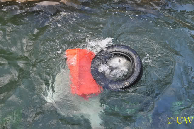Er hat eine elegante Art entdeckt, wie man den Reifen transportieren kann und trotzdem die Pfoten frei hat