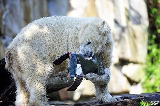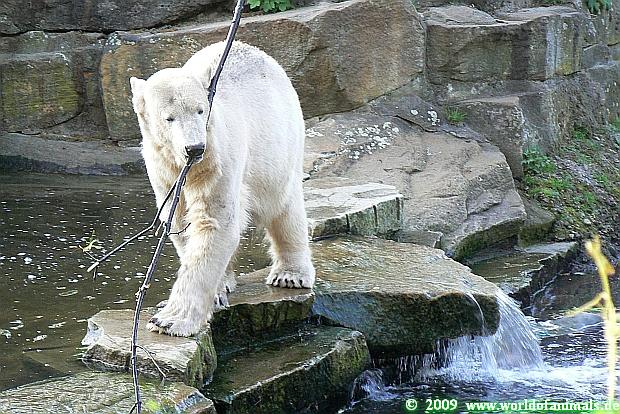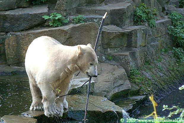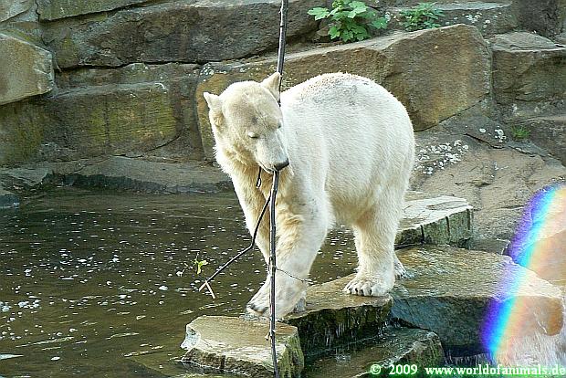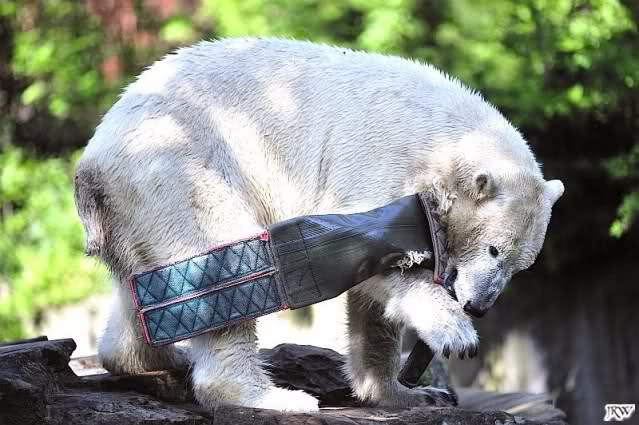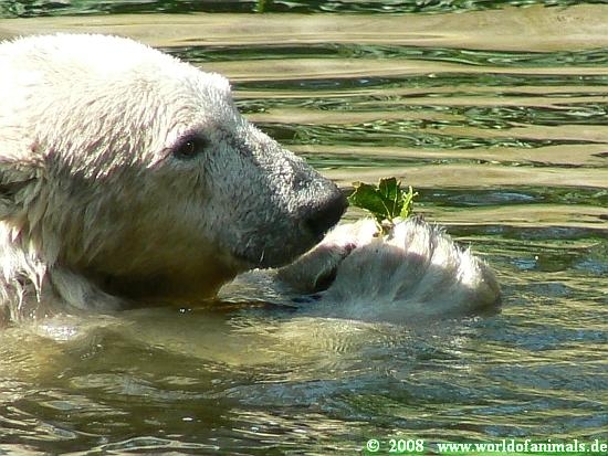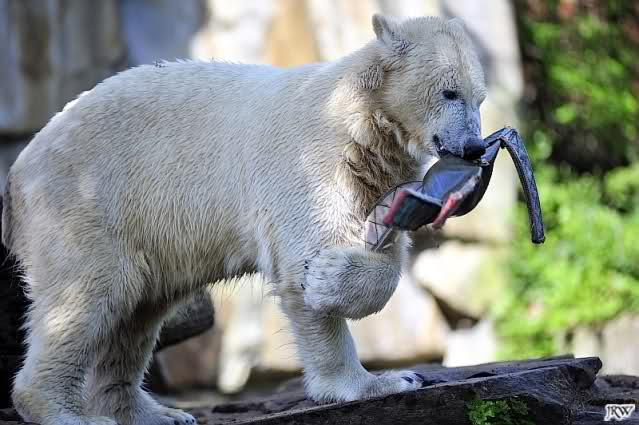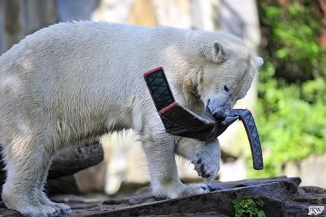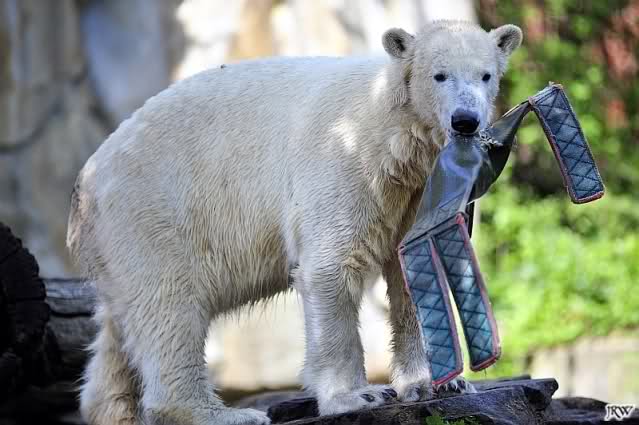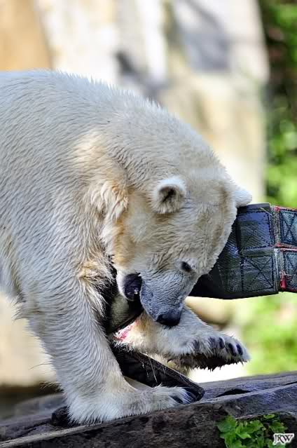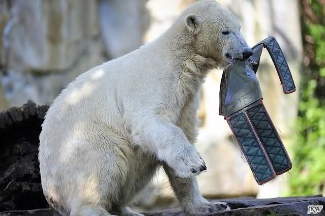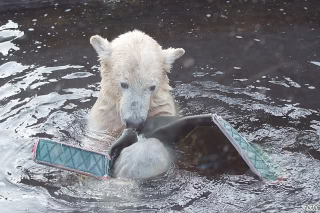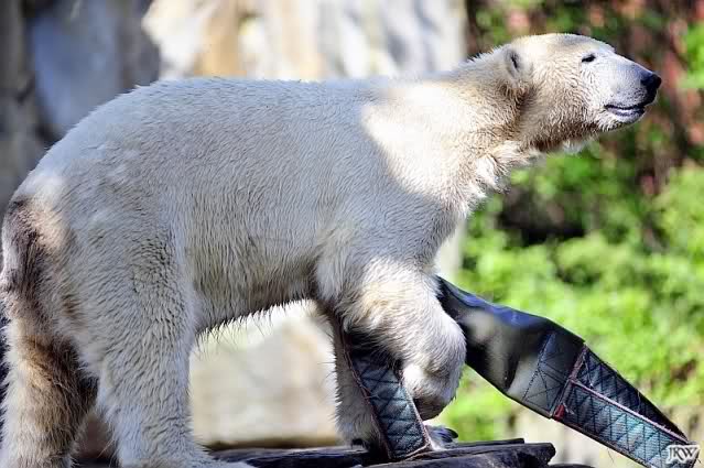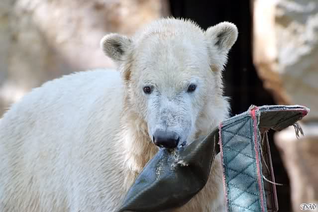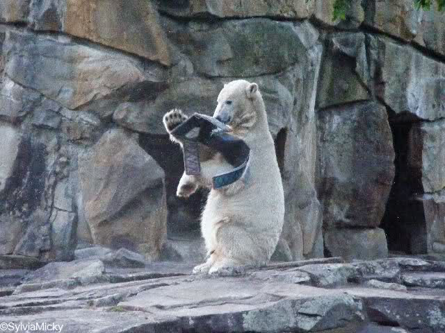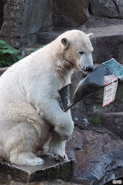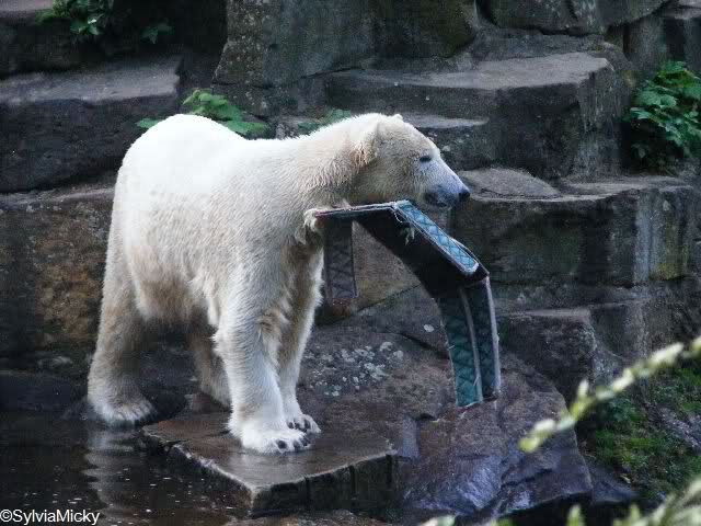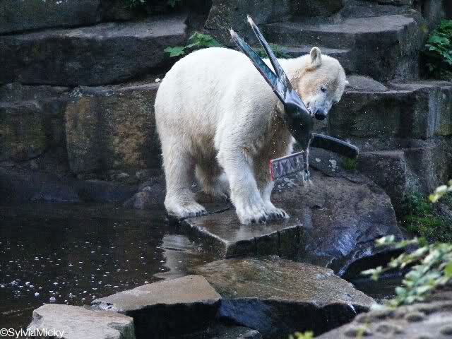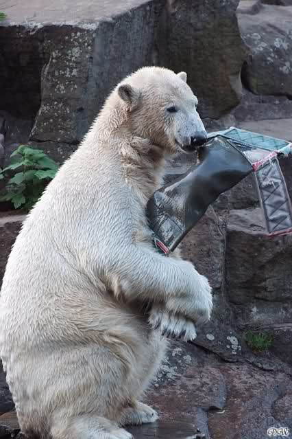 Ich zeige noch ein Foto aus dem Juni 2008. Mich haben die Bilder von gestern Abend, aufgenommen von Doris, beeindruckt, denn zeigen sie doch einen immer noch verspielten und jungen Eisbären, der gerade am Abend so sehr liebevoll mit seinen Spielsachen umgeht. So wie man es auf folgenden Foto von damals sehen kann.
