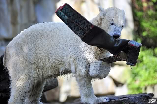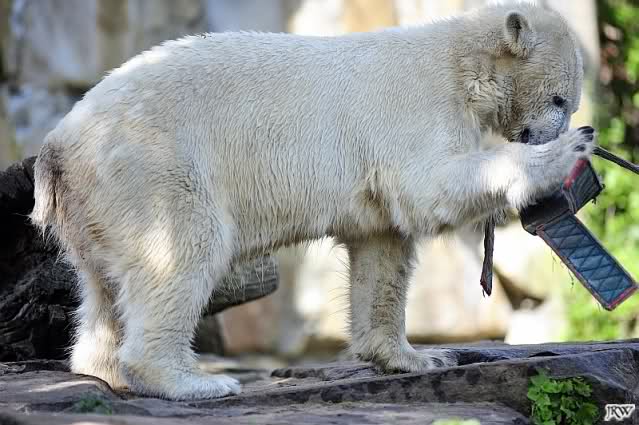Ich musste sofort an die Bilder von vor zwei Jahren denken, als ein damals noch winziger Knut eifrig mit dem Überzug des Mikrofons eines RBB-Kameramannes kämpfte.