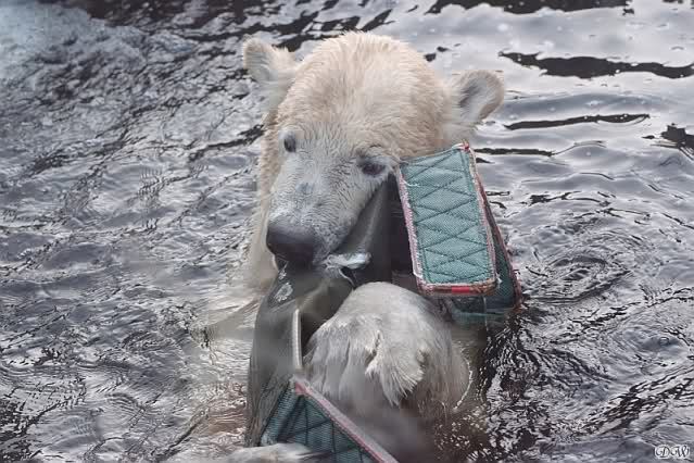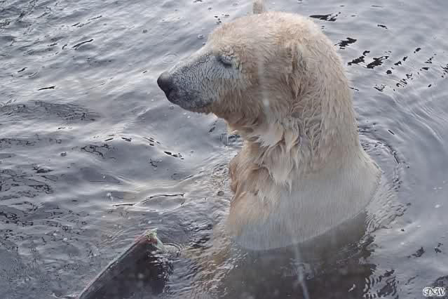 Knut hatte heute einen Ruhetag. Er tobte nicht so ausgelassen wie in der letzten Zeit. Als wir mitten in einer Fühung waren, bekamen wir den Anruf, dass Knut jetzt ausgelassen mit seinem geliebten Huhn im Wasser spielen würde. Also haben wir die Führung verlassen und sind zu ihm gegangen. Es hat sich auf jeden Fall gelohnt. Wir fanden einen fröhlichen kleinen Bären, der glücklich spielte.