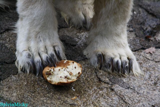 Vor der Fütterung lag er auf seiner rechten Ecke. Zur Fütterung bekam er u.a. ein Rosinenbrot. Beim Bäcker sieht es groß aus, zwischen den Pfoten von Knut sieht es aus wie ein Brötchen.