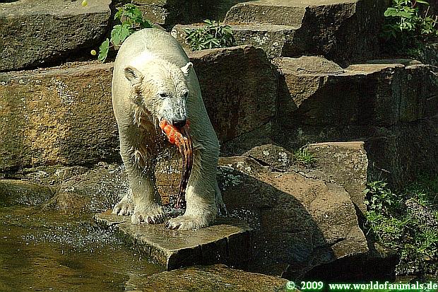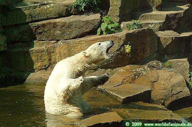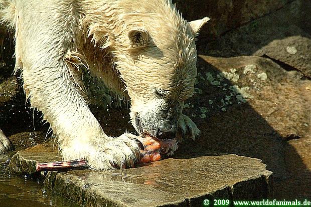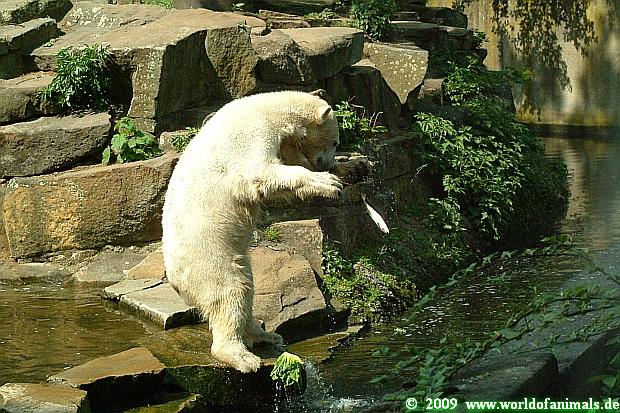 Nun zum heutigen Sonntag Nachmittag: Knut wurde von einer jungen Tierpflegerin gefüttert, erhielt eine gute Ration Futter, die aus Fisch, Weintrauben, Obst, Fleisch und einem Ochsenschwanz bestand.