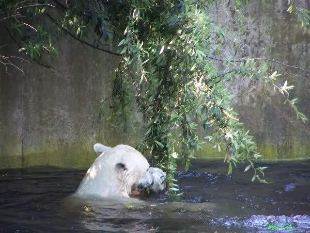 heute war mal wieder ein wunderschöner Zootag. Allerdings wurde es gegen Mittag rappelvoll. Knut war bestens gelaunt nachdem er bis ca. 10.00 Uhr geschlafen hatte. Er vergnügte sich mit so vielen Dingen, dass wir überrascht waren zu sehen, dass es bereits 13.00 war. Von nachsehen was die Damen im Kiosk machten, zu Entenschauen, Zuschauer genau beäugen, Blätter zupfen, kurz mit einem Ball spielen und natürlich durfte das geliebte Nackthuhn nicht fehlen. Damit spielte er über eine Stunde, bearbeitete es, klatschte es sich um die Ohren, warf es ins Wasser und sprang sofort hinterher und das Spiel begann von Neuem.