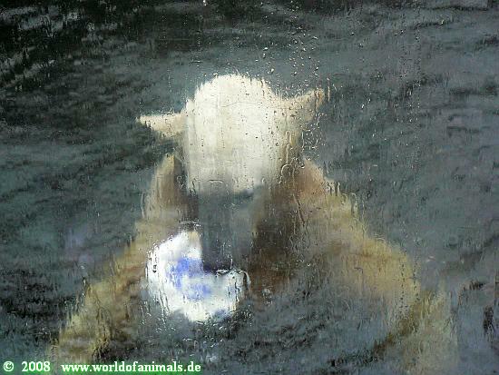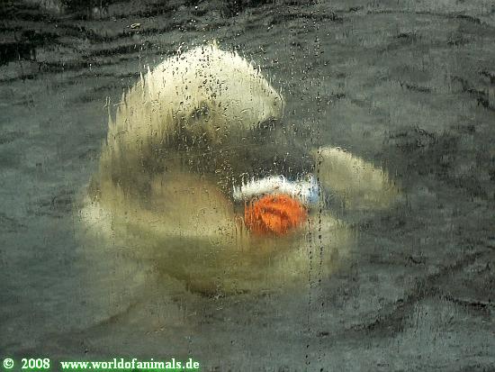 Nachdem der Großteil der Besucher vor dem Regen geflüchtet war, wurde Knut wieder so richtig niedlich. Er betrachtete alles und jeden, spielte mit zwei Sachen gleichzeitig, blies in das Abflussrohr das es nur so blubberte und schaute dann nach oben um zu sehen, ob es auch alle gehört hatten. Er versuchte seinen Ball aus dem Wasser über die Scheibe zu werfen, aber das muss er noch ein wenig üben. Ansonsten hatte er einen juckigen Abend, er kratze hier, da und praktisch überall (Bilder folgen wenn Uli uns gnädig ist).