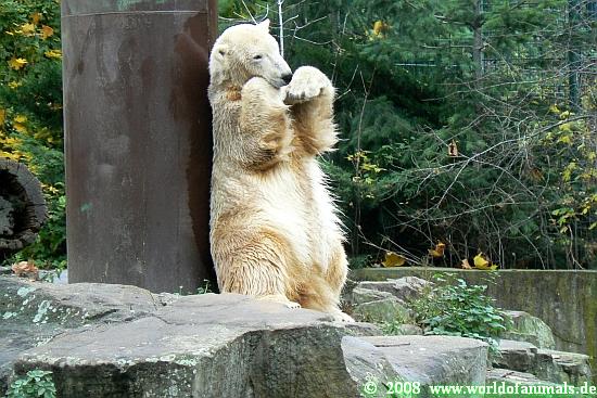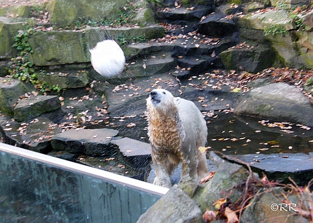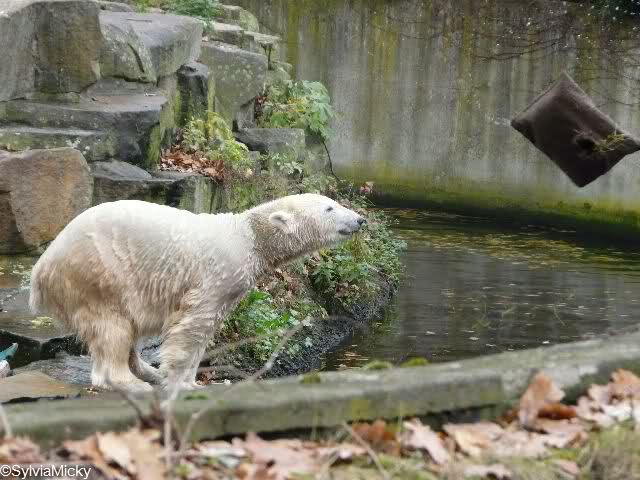 Good evening to you all Knut friends around the world. First thanks to all the pictures, collages and informations today. We can see that Knut is in a good mood. He love to play with his visitors.
