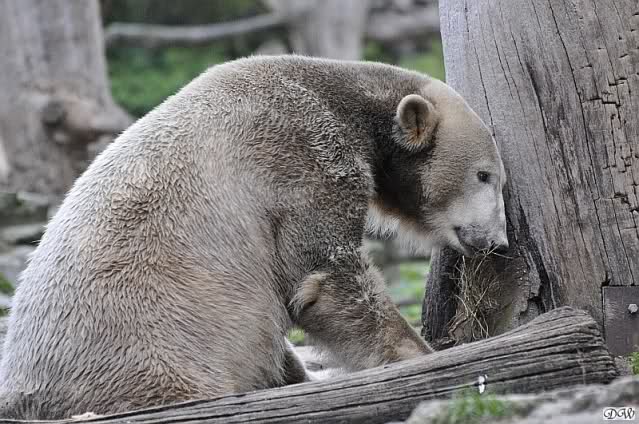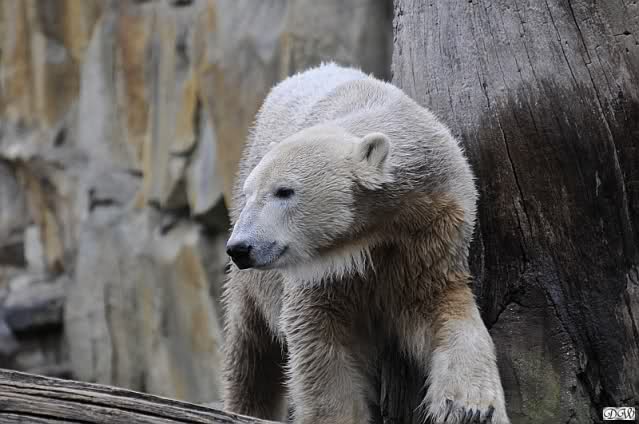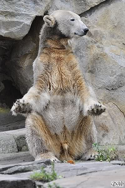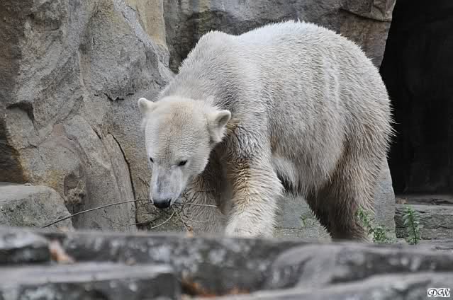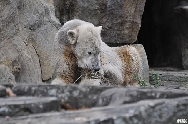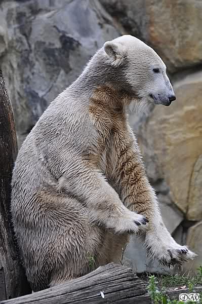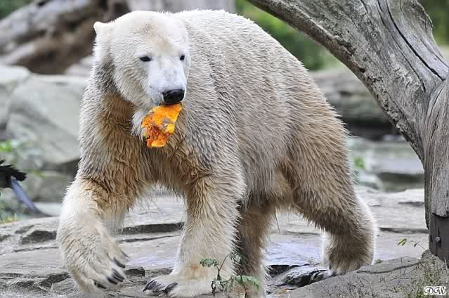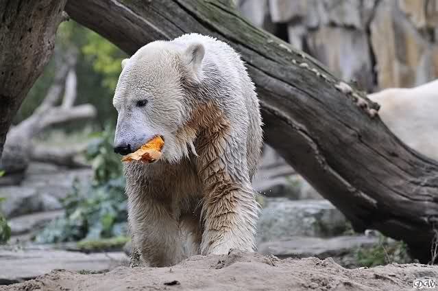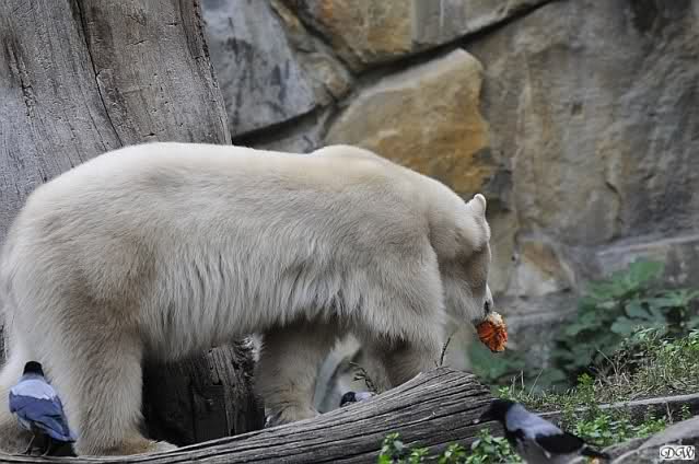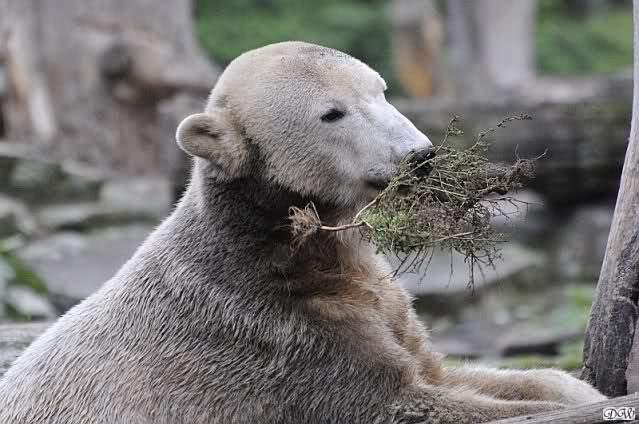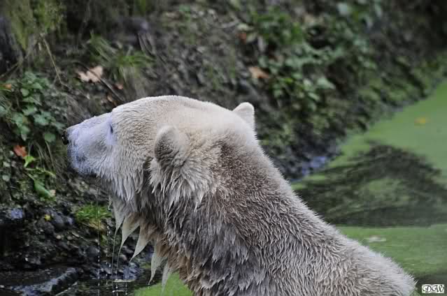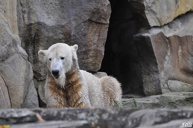 "Einmal fürchtete er (Knut) sich vorm Wind draußen. Er hörte das Rauschen, spitzte die Lippen und prustete - TYPISCHE REAKTION EINES EISBÄREN, WENN ER SICH BEDRÄNGT FÜHLT."