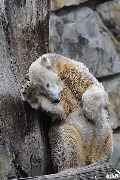 Katharina, im Falle von Gianna ist es durchaus so, dass sich Knut bedrängt fühlt. Da stimme ich Ihnen zu. Allerdings ist das nicht die einzige Zeit wo Knut diese Schnute oder Tapirlippe (wie wir es getauft haben) macht. Es ist auch offensichtlich ein Zeichen von starkem Nachdenken, oder wie immer Sie es nennen wollen. Diese Schnute haben wir über und über erlebt und fotografiert wenn Knut spielte. Hier ein paar Beispiele: