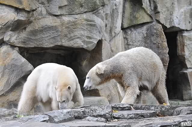 Gianna beherrscht sozusagen das Gehege (deshalb sieht mal diese Mimik bei ihr auch viel seltener) - seine Gänge sind in der Regel Reaktionen auf ihre Gänge, wobei er stets versucht, eine gewisse Distanz einzuhalten. Bricht sie in seinen Distanzraum ein, dann bemerkt man diesen Ausdruck, manchmal begleitet von einen Schnauben, Prusten.