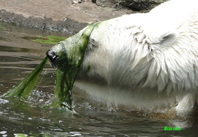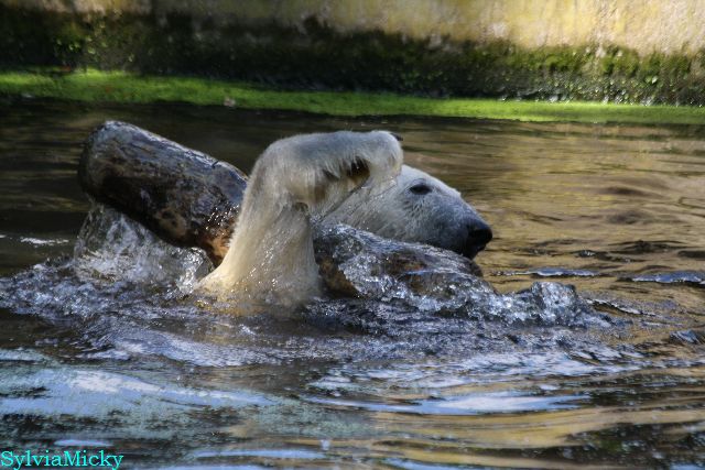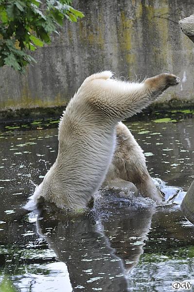 An einem weiteren heißen und schwülen Tag, zeigte Knut wieviel Kraft er trotzdem noch hat. Er schleuderte den großen Baumstamm im Wasser hin und her. Gianna ging auch ab und zu ins Wasser, aber gemeinsames spielen war auch heute nicht angesagt.