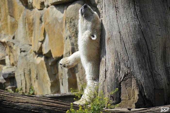 Die großen Eisbären liegen oftmals erst lange auf den heißen Steinen. Meistens toben sie mindestens zwei Mal pro Tag im Wasser, wir haben es auch schon drei Mal gesehen. Dazwischen liegen sie entweder in dem bisschen Schatten, den die Felswand bietet. Katjuscha meistens im Höhleneingang. Da schleppt sie auch ihre Stöckchen, Kokosnussreste oder Futter hin.