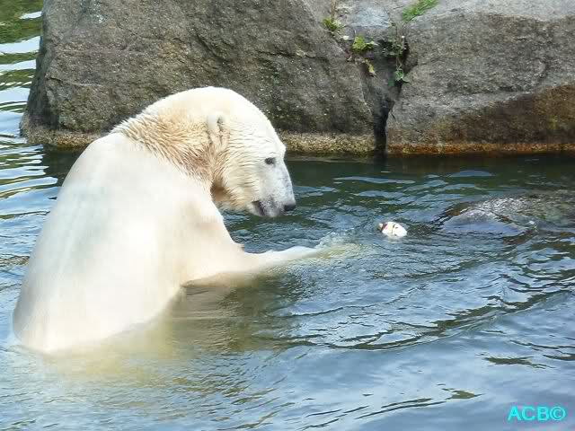 Was mir noch auffällt ist, dass Ihr Euch alle freut, dass Knut so schön mit dem Ball spielt/ gespielt hat. Auf der anderen Seite lese ich, dass Tosca heute einen Ball auseinandergenommen hat und als ich heute kam, war keine Spur mehr davon zu sehen....- Vielleicht ist das mit den Bällen korrekt, dass die ungern bis gar nicht von den Pflegern gegeben werden. Wenn ein Tier Teile von dem Gummi frißt, möcht ich mir gar nicht vorstellen, was alles passieren kann