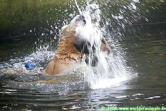 Knut schlief am Vormittag und begann seine Futterwanderung um 11:30 h. Gegen 14:15 h gab es heute bereits die Fütterung durch Markus Röbke. Knut bekam heute reichlich Fisch, aber sein Pfleger machte es Knut nicht leicht, vieles versank zunächst im Wasser, was Knut überhaupt nicht gefiel. Das hieß ja: Ab ins Wasser, was er heute nicht so wollte. Die Fütterung war schnell vorbei, Knut irgendwann im Wasser. Knut schwamm im Wassergraben auf und ab, hielt seine fotografierenden Fans in Trab. Irgendwann kämpfte er mit dem Jutesack, davon gleich.