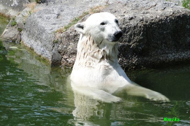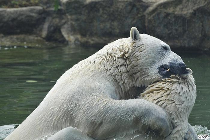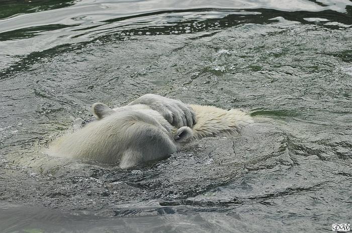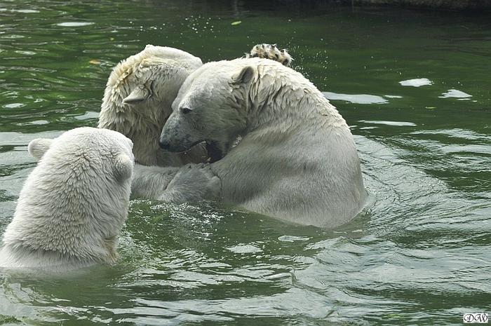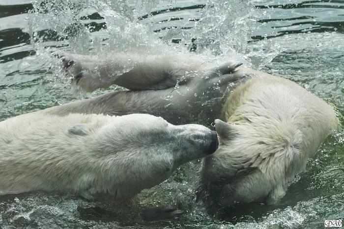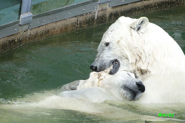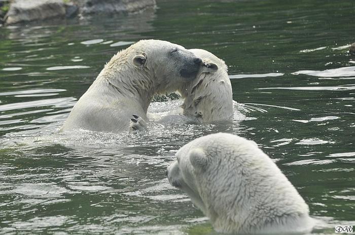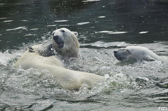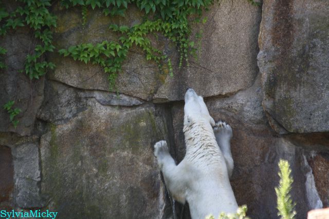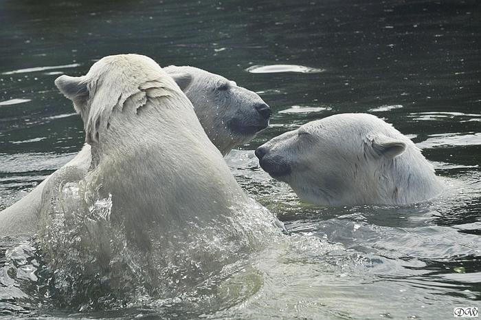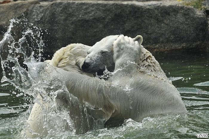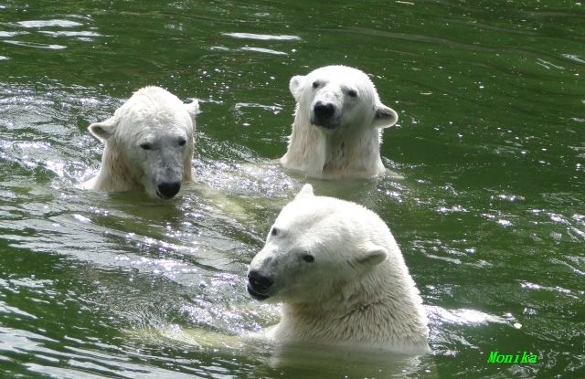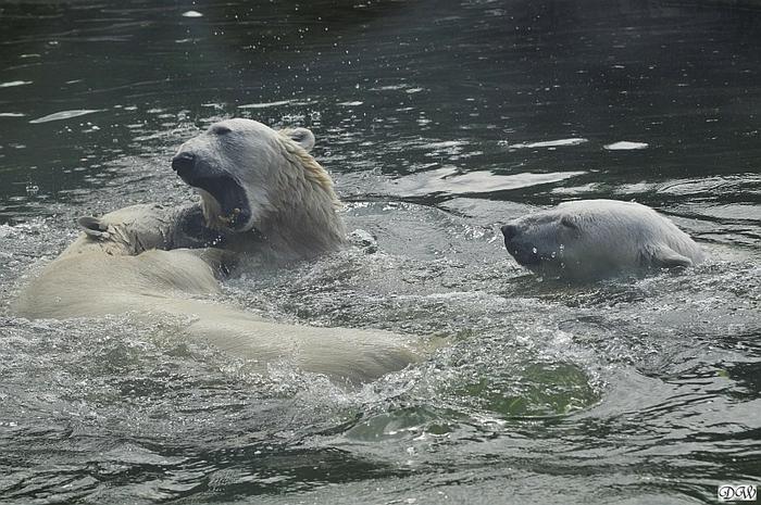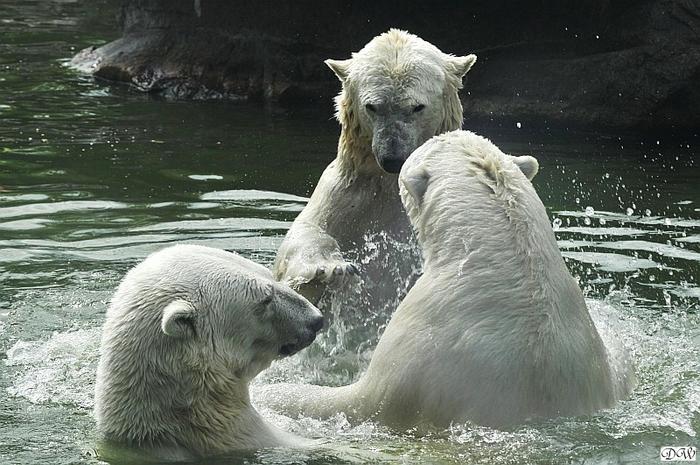 Wasserspiele der drei großen Eisbären. Wie so oft, spielten am Donnerstag erst Nancy und Tosca zusammen und später gesellte sich dann Katjuscha dazu. Ganz verschieden ist die Verweildauer. Manchmal verlässt Tosca nach ausgiebigem Toben das Trio. Dann spielen Nancy und Katjuscha weiter. Gestern kam Katjuscha später und ging dann auch wieder als Erste. Die Lebensfreude ist ihnen auf jeden Fall anzusehen. Nach den Wasserspielen braten sie oftmals lange Zeit in der Sonne. Danach gehen sie meistens noch einmal ins Wasser und legen sich dann in den Schatten nahe an der Wand. Nancy fast immer an der gleichen Stelle. Katjuscha hat den Höhleneingang sowieso gemietet.