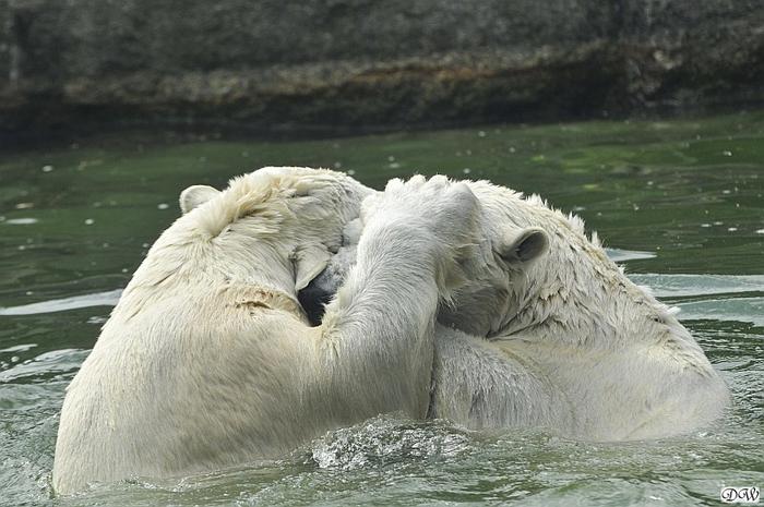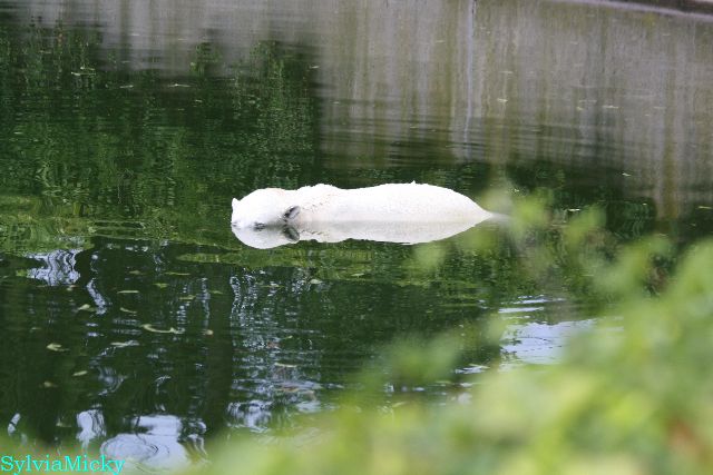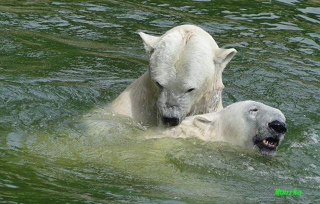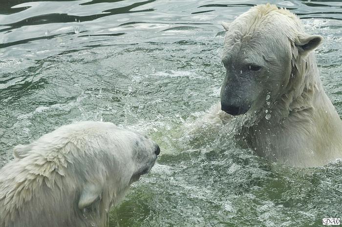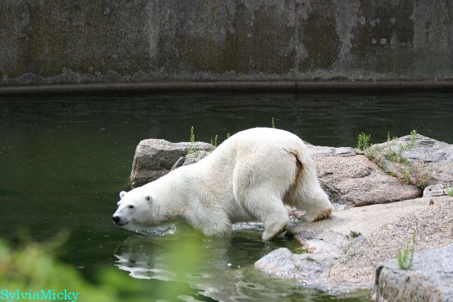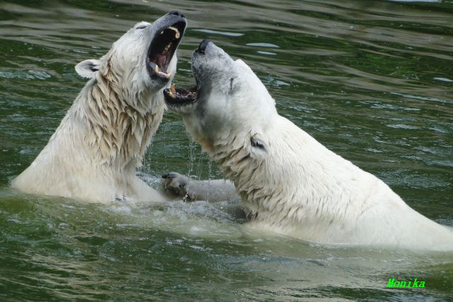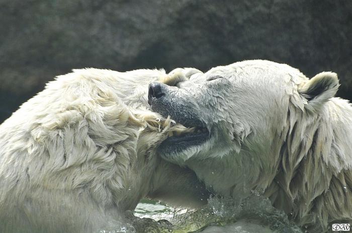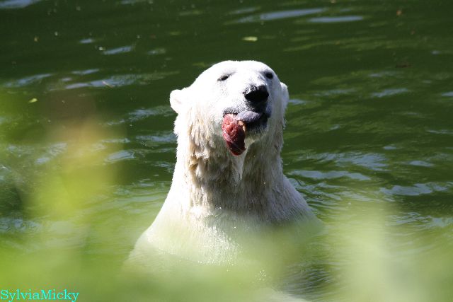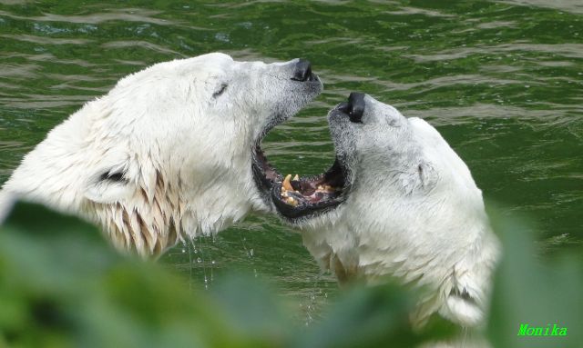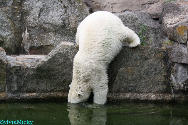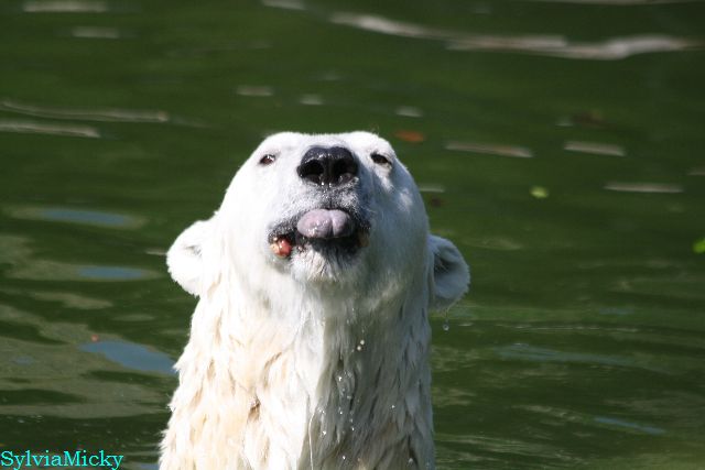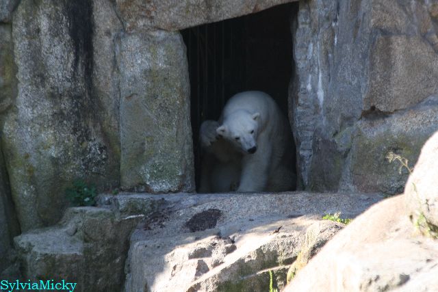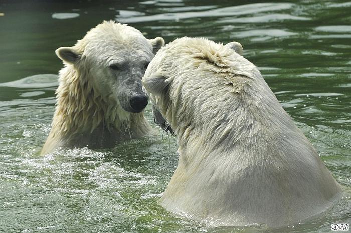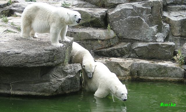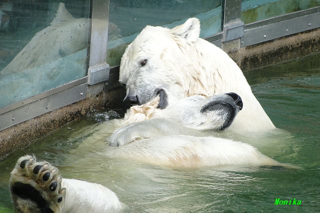 Wasserspiele der drei großen Eisbären. Wie so oft, spielten am Donnerstag erst Nancy und Tosca zusammen und später gesellte sich dann Katjuscha dazu. Ganz verschieden ist die Verweildauer. Manchmal verlässt Tosca nach ausgiebigem Toben das Trio. Dann spielen Nancy und Katjuscha weiter. Gestern kam Katjuscha später und ging dann auch wieder als Erste. Die Lebensfreude ist ihnen auf jeden Fall anzusehen. Nach den Wasserspielen braten sie oftmals lange Zeit in der Sonne. Danach gehen sie meistens noch einmal ins Wasser und legen sich dann in den Schatten nahe an der Wand. Nancy fast immer an der gleichen Stelle. Katjuscha hat den Höhleneingang sowieso gemietet.
