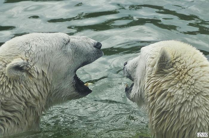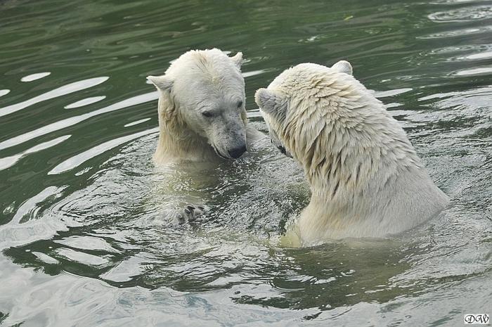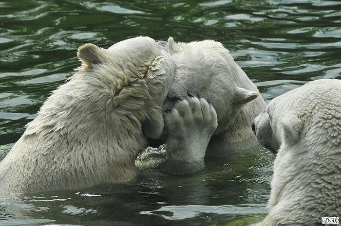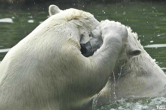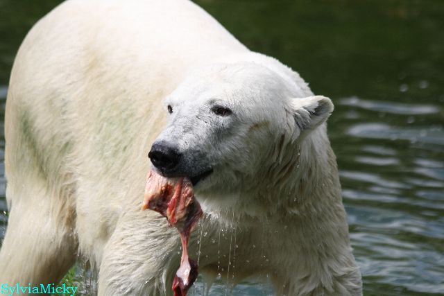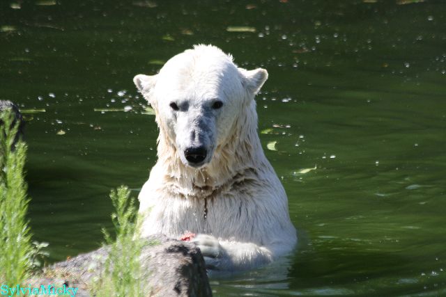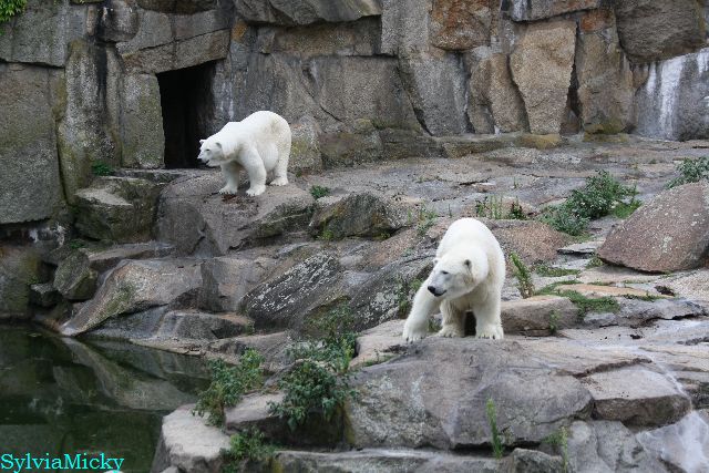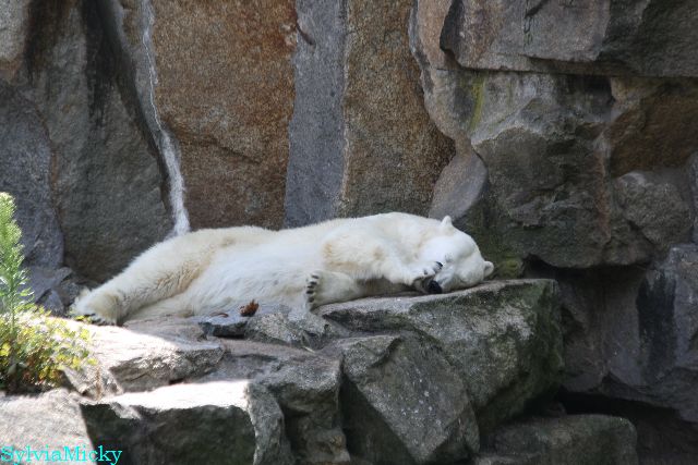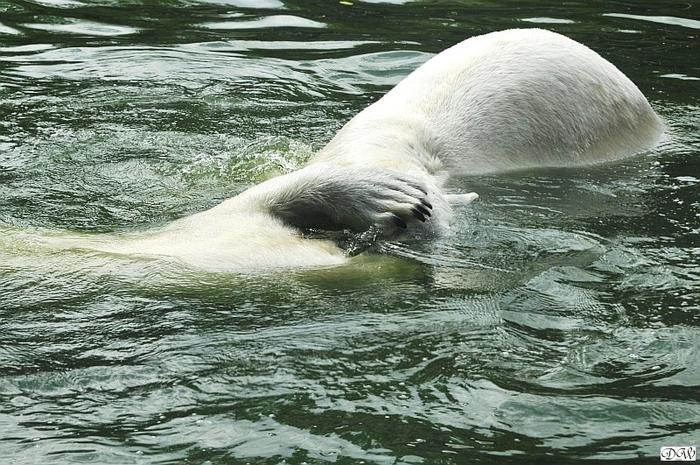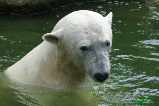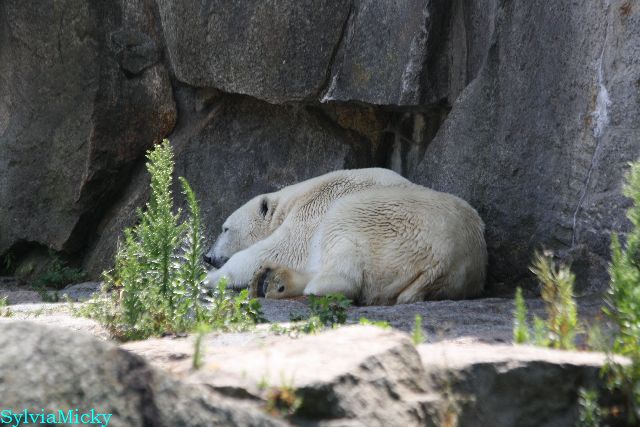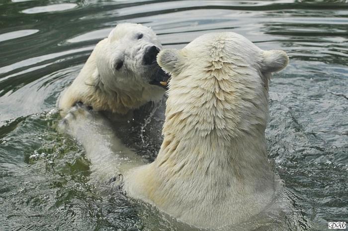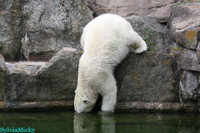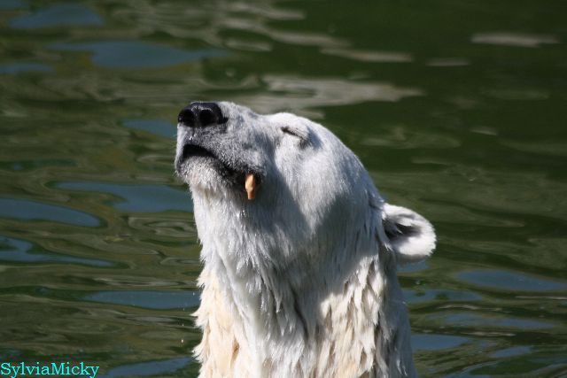 Wasserspiele der drei großen Eisbären. Wie so oft, spielten am Donnerstag erst Nancy und Tosca zusammen und später gesellte sich dann Katjuscha dazu. Ganz verschieden ist die Verweildauer. Manchmal verlässt Tosca nach ausgiebigem Toben das Trio. Dann spielen Nancy und Katjuscha weiter. Gestern kam Katjuscha später und ging dann auch wieder als Erste. Die Lebensfreude ist ihnen auf jeden Fall anzusehen. Nach den Wasserspielen braten sie oftmals lange Zeit in der Sonne. Danach gehen sie meistens noch einmal ins Wasser und legen sich dann in den Schatten nahe an der Wand. Nancy fast immer an der gleichen Stelle. Katjuscha hat den Höhleneingang sowieso gemietet.