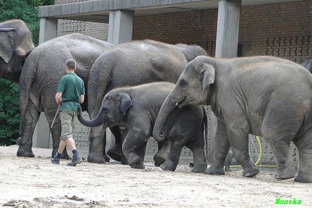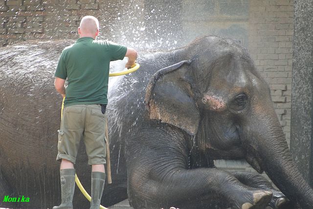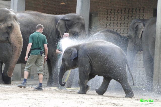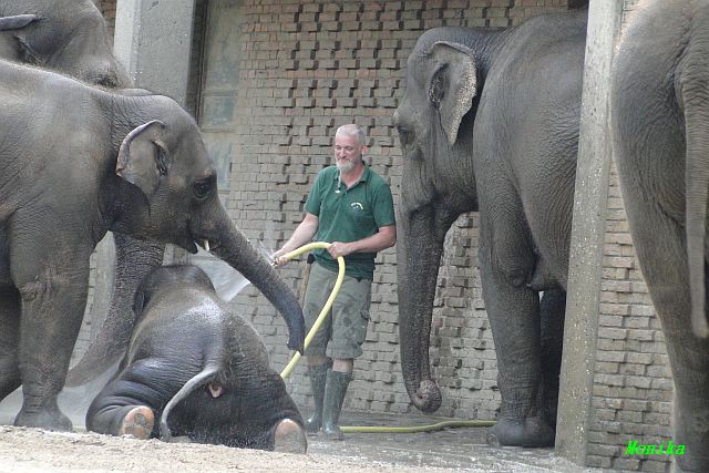 Duschen bei den Elefanten. Während die großen Elefanten zur Dusche anstanden, machte der Pfleger mit Ko Raya und Shaina ein paar Übungen um sie abzulenken. Ko Raya hing dem Pfleger ständig am Hemdzipfel, denn in seiner Bauchtasche waren Leckerlis versteckt.