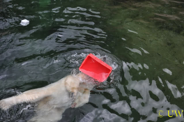 Vera tollte im Wasser herum und steckte den Kopf in die rote Kiste - das hat Flocke auch immer gerne gemacht.