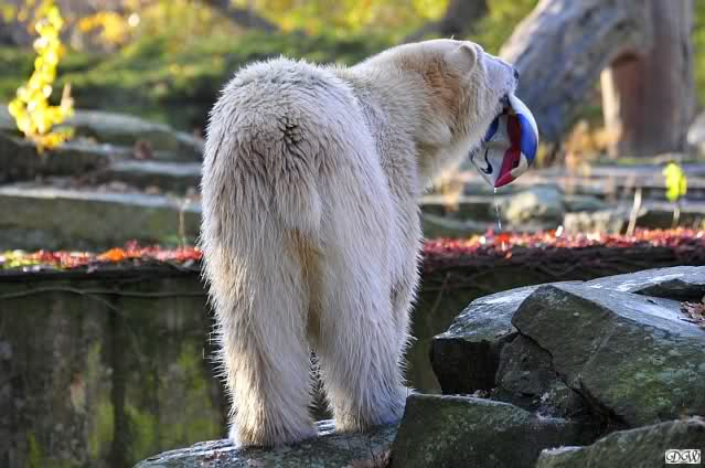Irgendwann schnappte sie sich den Ball und Knut flitzte ihr hinterher. Es schien ihr Freude zu bereiten sein verdrossenes Gesicht zu sehen. Als er aufgab und sich hinlegte, nahm sie den Ball und zeigte ihn Jürgen. Als der auch nicht beeindruckt war, stelle sie sich mit Ball auf die Hinterbeine. Auch das interessierte ihn nicht sonderlich. Irgendwann fiel er ihr dann vom Felsen hinunter ins Wasser. Sie überlegte einen Augenblick und entschied sich nicht hinterher zu springen.