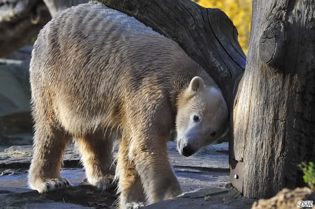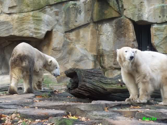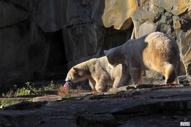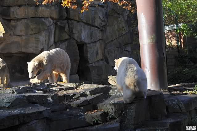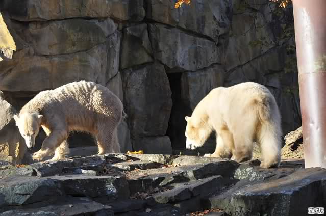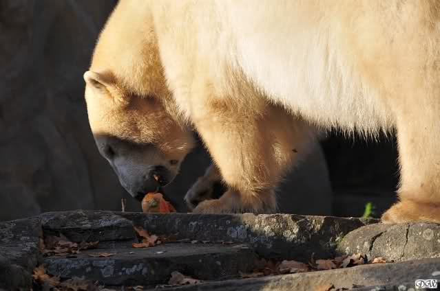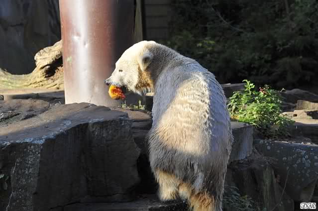 Gianna sorgte fest dafür, dass sie heute in die Höhle kam und nicht Knut. Als sie allerdings zurückkam, führte der direkte Weg nach unten. Knut hatte seinen Kürbis halb aufgefressen und flüchtete mit dem Rest. Gianna checkte, ob in dem kleinen Pool etwas zu finden war und schaute sogar, ob vielleicht ein Pfleger ihr noch etwas zuwerfen wurde. Frau Weckert war aber schon weg. Also flitzte sie nach oben zu Knut und er - tja, er ließ seinen halben Kürbis fallen und sie verspeiste einen Großteil davon.