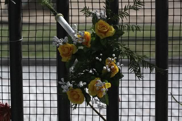 Der Zaun neben dem Kartenverkauf ist immer noch mit Blumen und Bildern geschmückt. Davor stehen brennende Kerzen. Ich hatte auch eine Kerze mitgebracht und stellte sie dazu.