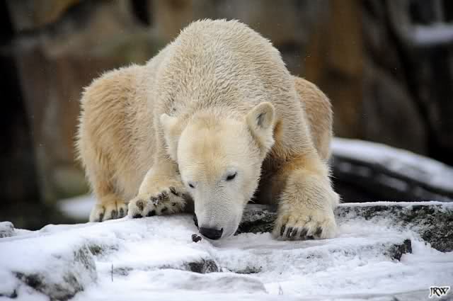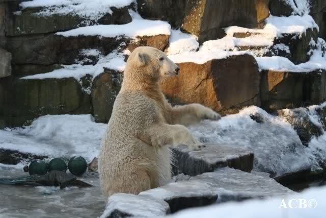 Zwischendurch kletterte Knut immer wieder oben auf seine Anlage. Obwohl die Steine dick vereist waren, ist Knut sehr geschickt im Klettern. Logisch, er ist ja ein Eisbär! Oben angekommen, schnüffelte er im Schnee herum, aß davon und wälzte sich darin herum. Es sieht einfach hinreißend aus, wenn Knut sich im Schnee wälzt!